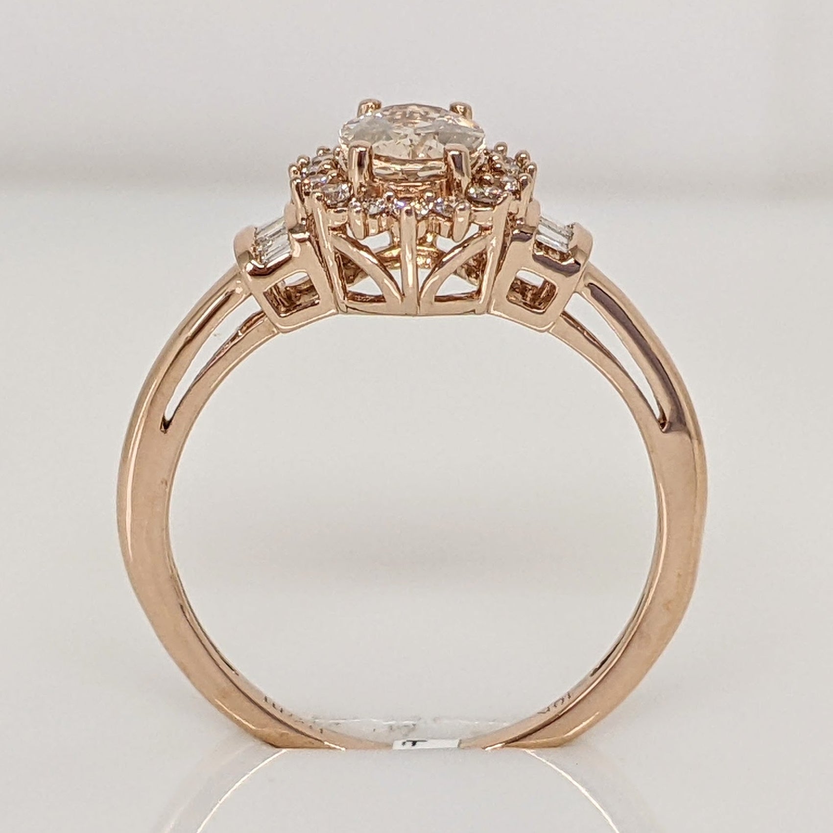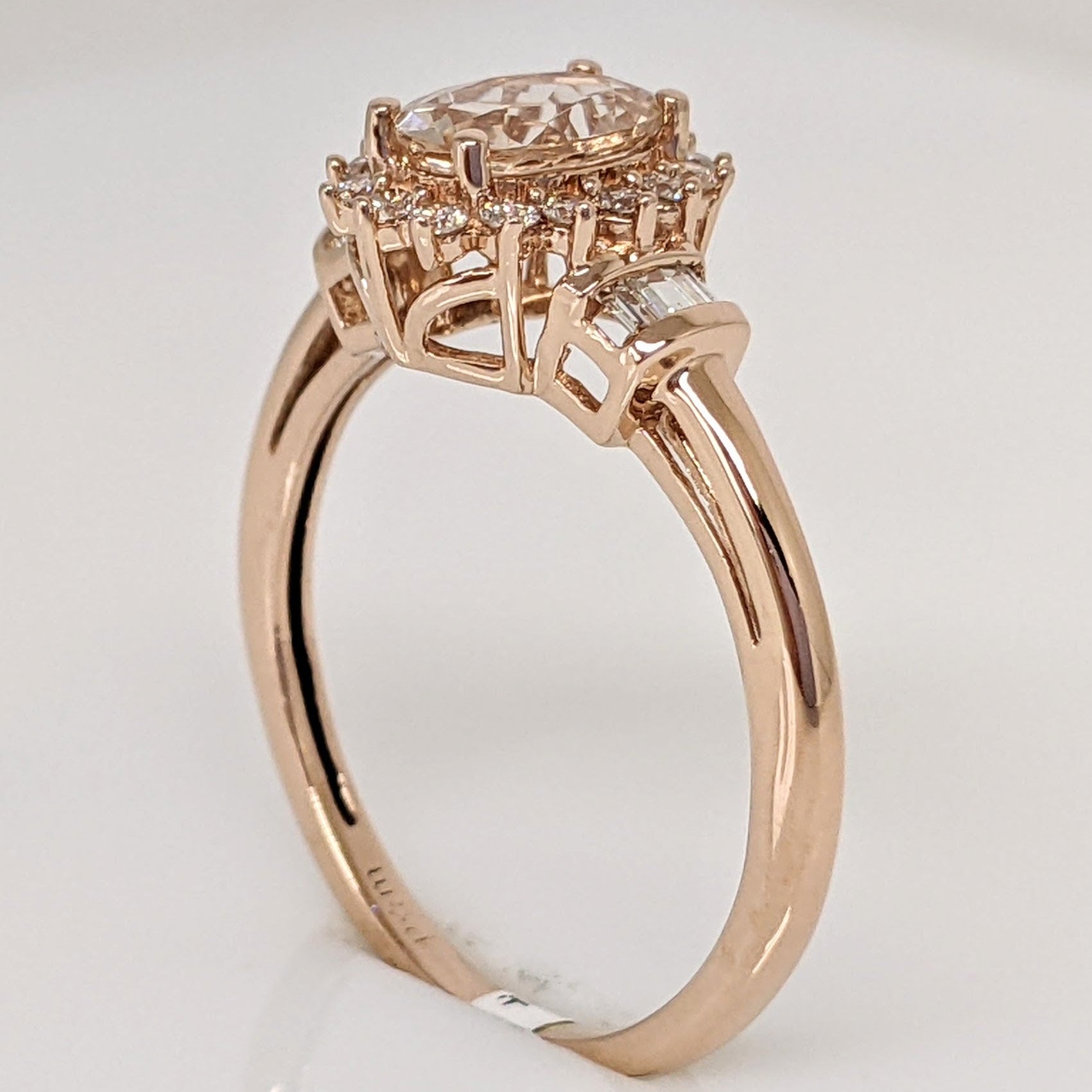 10K ROSE MORGANITE OVAL 5X7 WITH (16) ROUND (8) BAGUETTE .21 DIAMOND TOTAL WEIGHT ESTATE RING 1.8 GRAMS