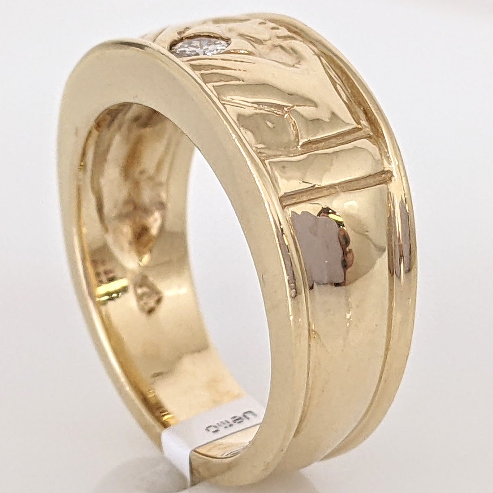 14k yellow gold .10ct diamond band. The Claddagh design band contains one bezel set diamond with a color and clarity of SI2 I. The ring weighs 8.9 grams