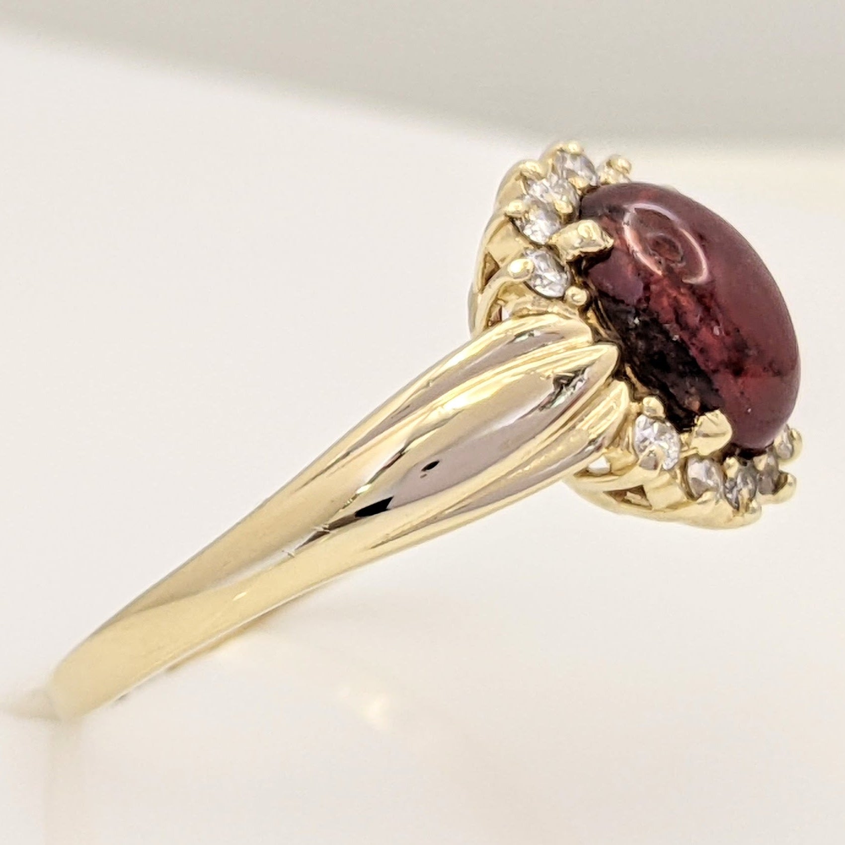 14K LAB-CREATED RUBY CABOCHON OVAL 7X9 WITH .18 DIAMOND TOTAL WEIGHT ESTATE RING 4.3 GRAMS