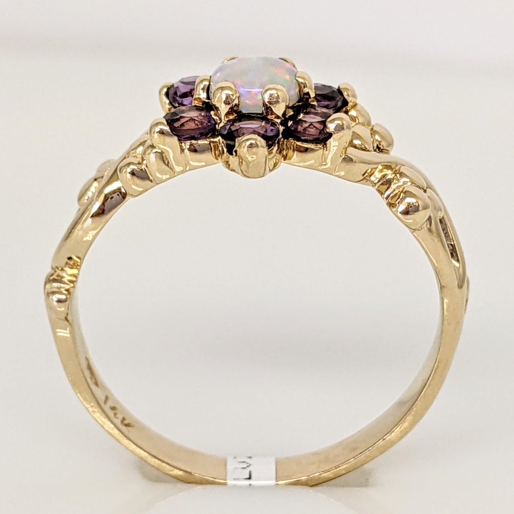 14K OPAL ROUND 4MM (1) AMETHYST 2.5MM (6) FLORAL ESTATE RING 2.6 GRAMS