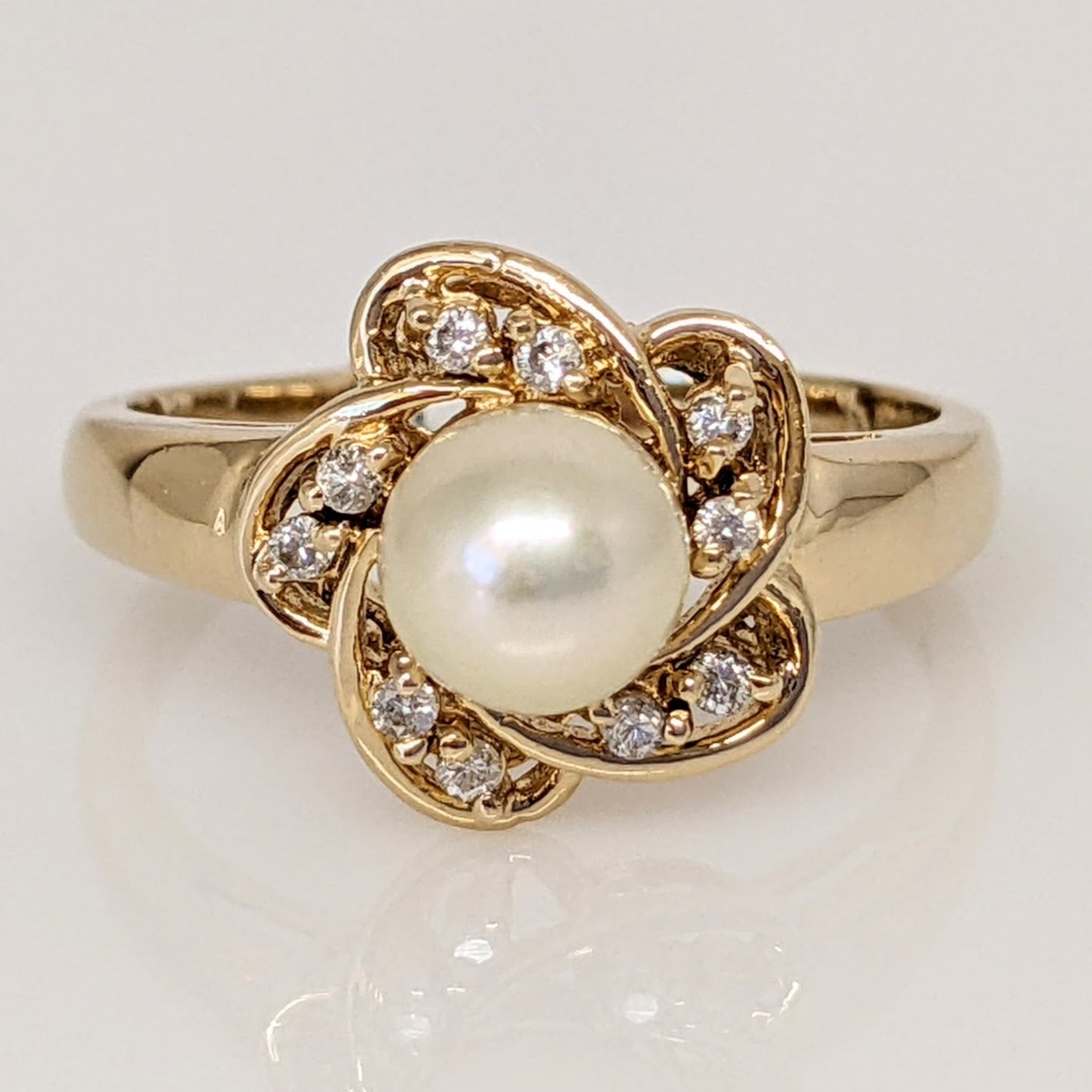 14K PEARL ROUND 5.9MM WITH (10) MELEE TWIST TOP ESTATE RING 3.1 GRAMS