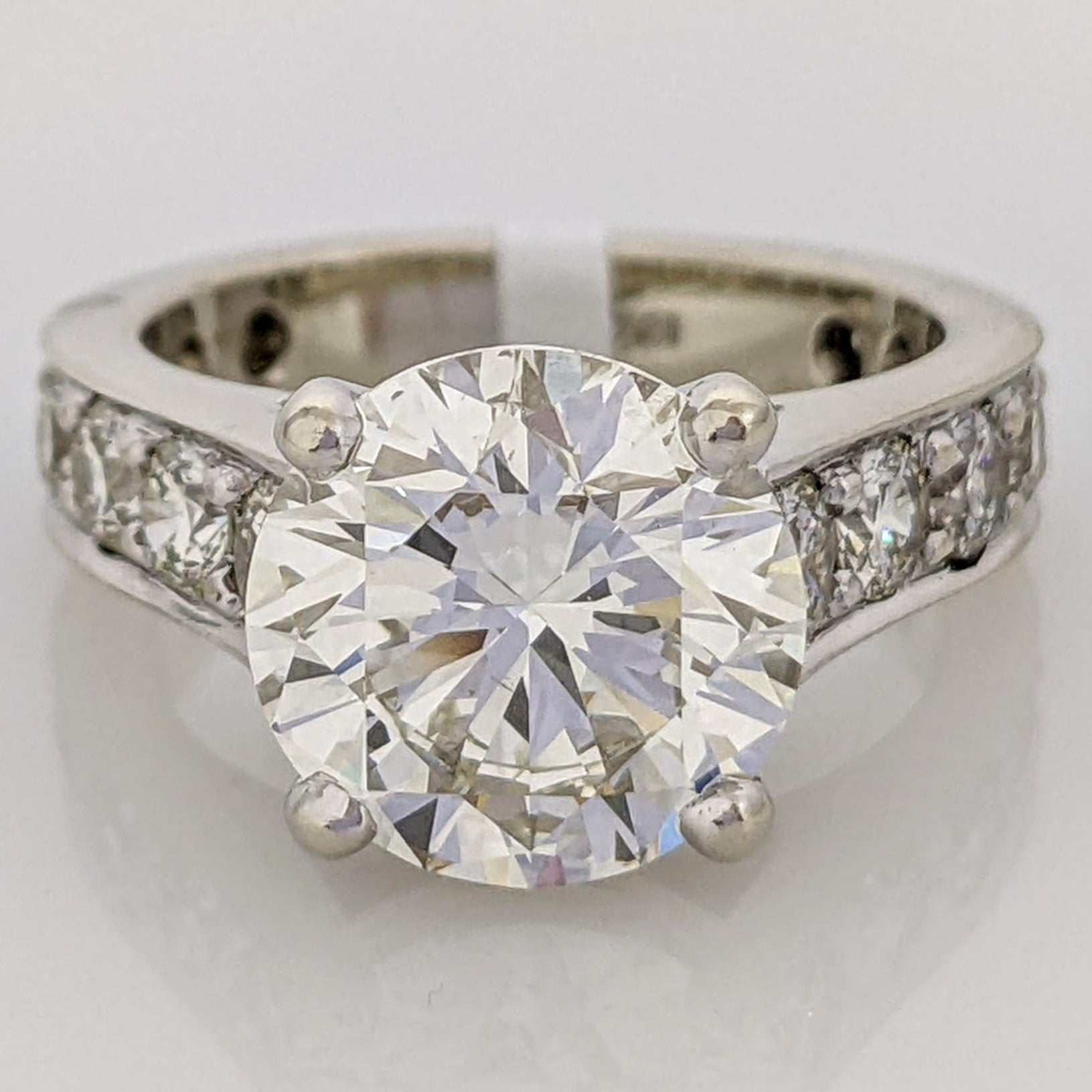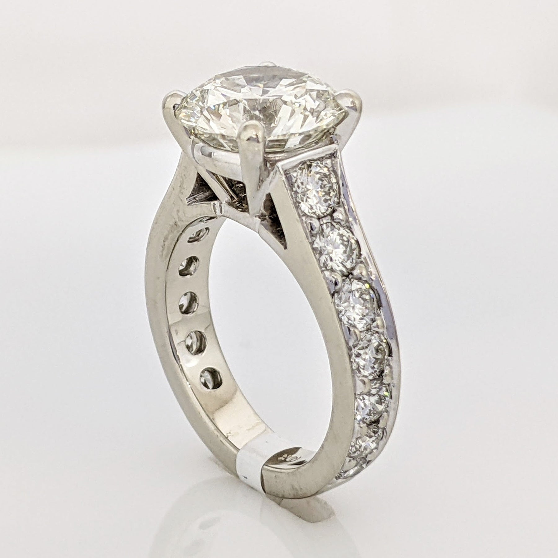 This elegant estate ring features a dazzling 3.44 carat total weight SI1 L diamond round center stone surrounded by 14 SI H diamonds, with a total diamond weight of 1.32 carats. Crafted from 18KW gold, this stunning ring weighs 7.0 grams.