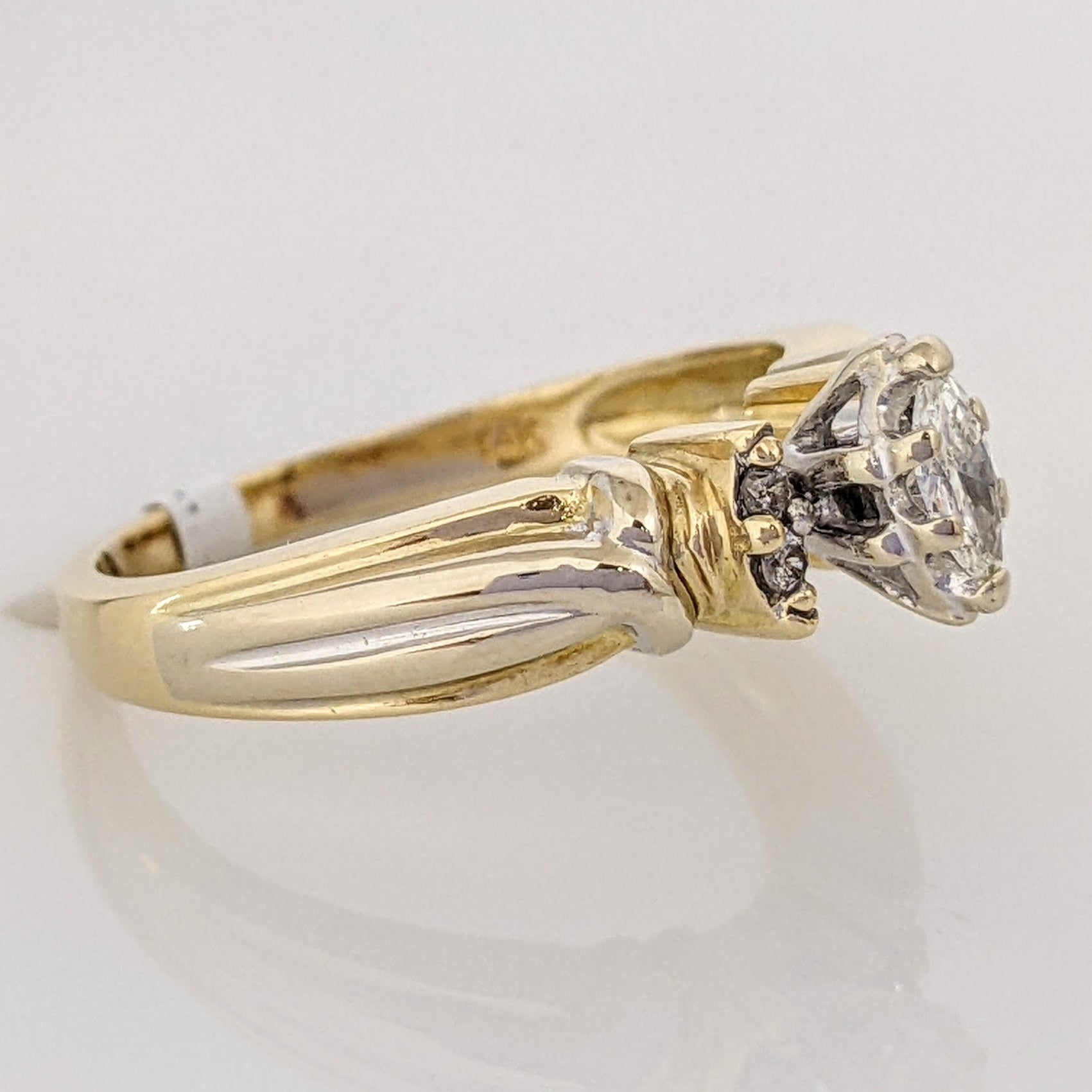 This sparkling estate ring features a 14K gold band with four round diamonds and a marquise-cut diamond of 0.28 carat total weight. SI2 clarity and H grade color ensure an eye-catching appearance, with a weight of 4.3 grams. Perfect for a special occasion.