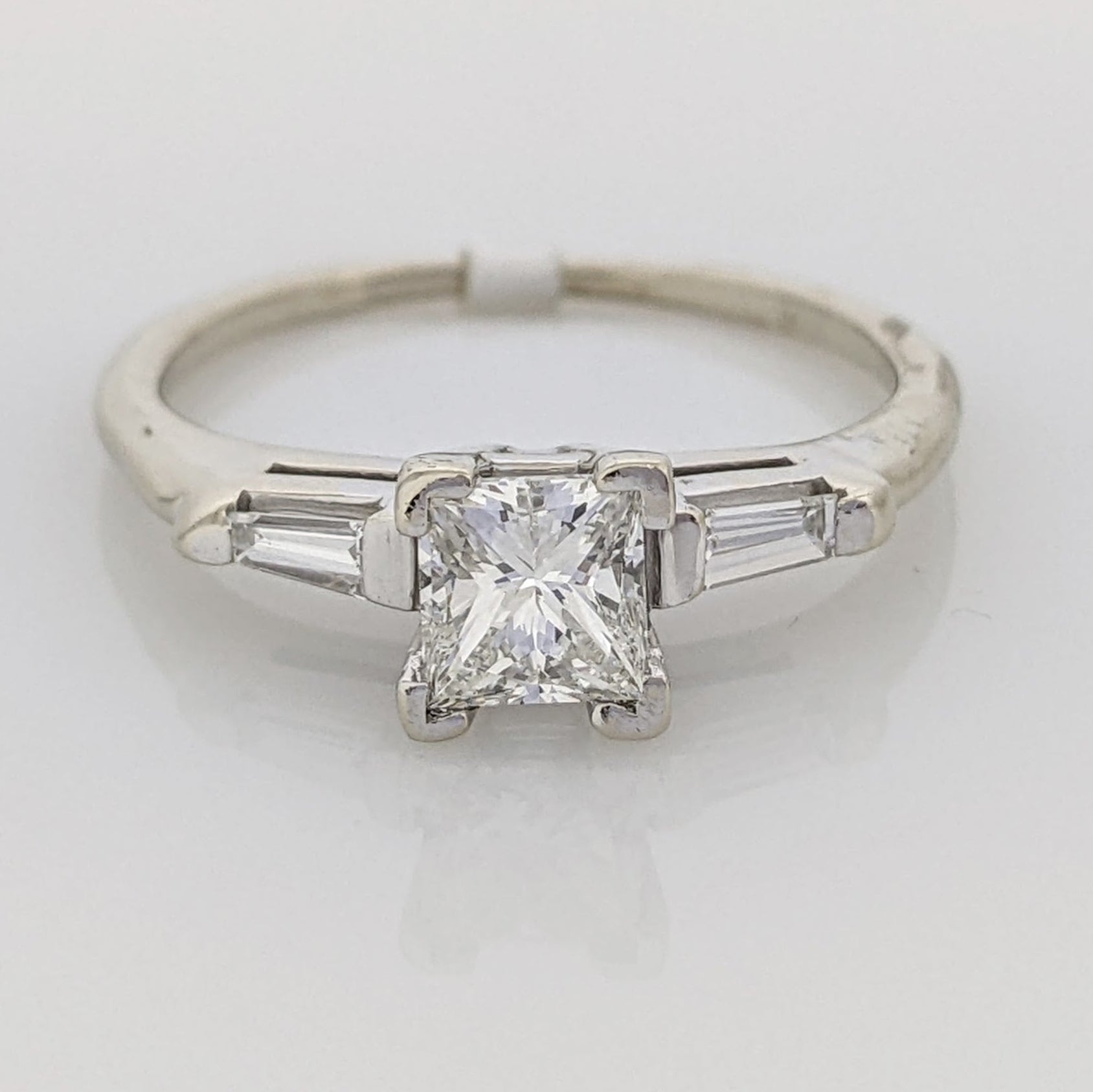 This estate ring features a .53 carat VS1 I diamond princess cut with two baguette tapered diamonds set in 14KW. Expertly crafted for a timelessly elegant look.