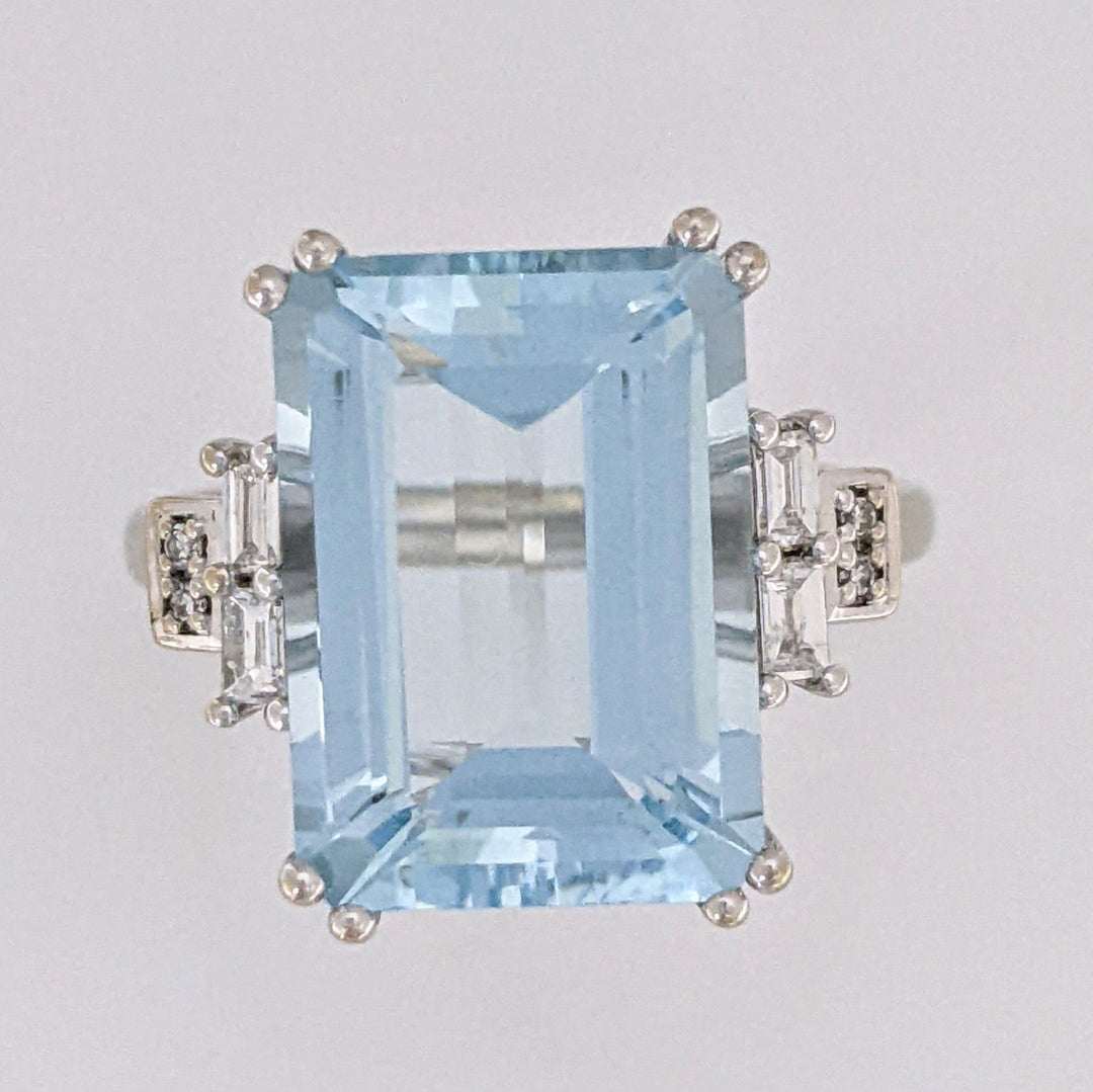 14K WHITE AQUAMARINE EMERALD CUT 10X14 WITH (4) BAGUETTE (4) ROUND MELEE ESTATE RING 5.2 GRAMS