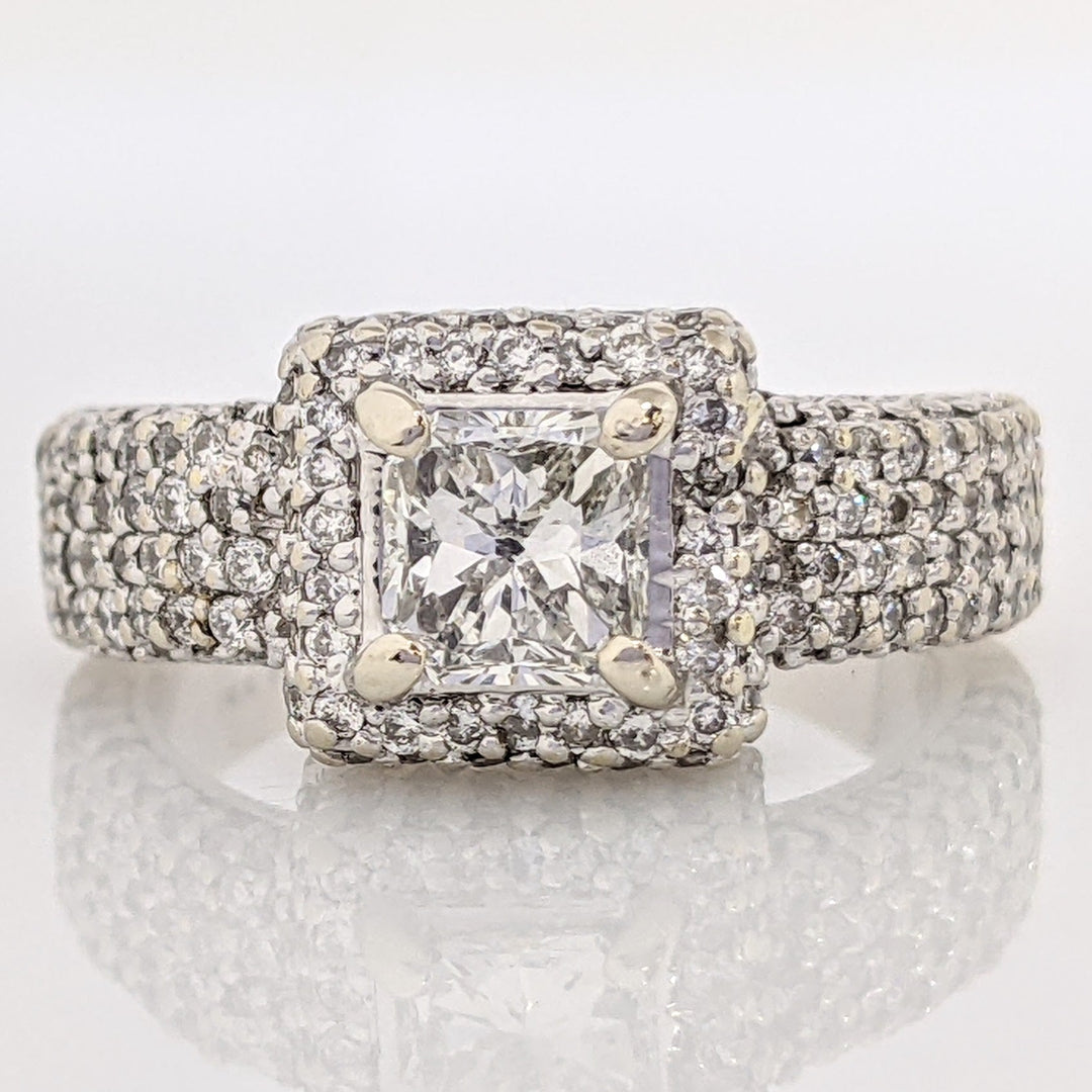14K WHITE 1.45 CARAT TOTAL WEIGHT I1 J DIAMOND PRINCESS CUT WITH (148) ROUND ESTATE RING 5.8 GRAMS