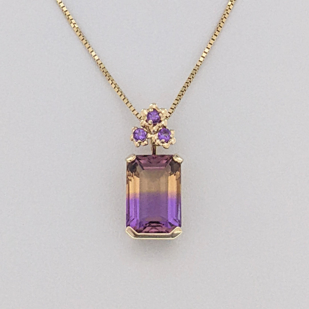 14K AMETRINE EMERALD CUT 10X12 WITH (3) ROUND AMETHYST ESTATE PENDANT & CHAIN 6.1 GRAMS