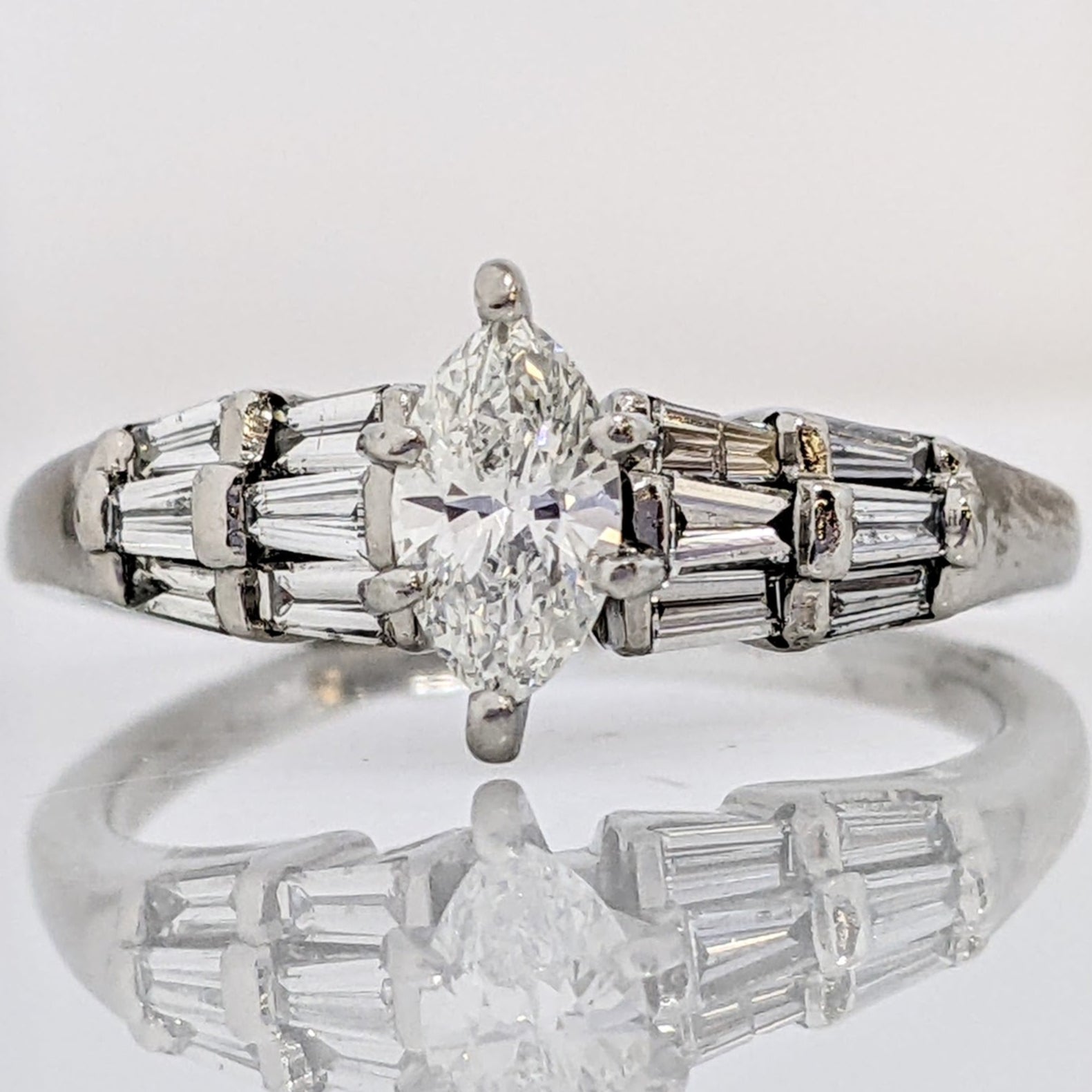 This stunning estate ring is crafted from Platinum and weighs 6.1 grams. It boasts a total diamond weight of .62 carats and features 3 marquise and 8 baguette diamonds, all rated SI2 and F in color. Enjoy the glamour of this exquisite ring.