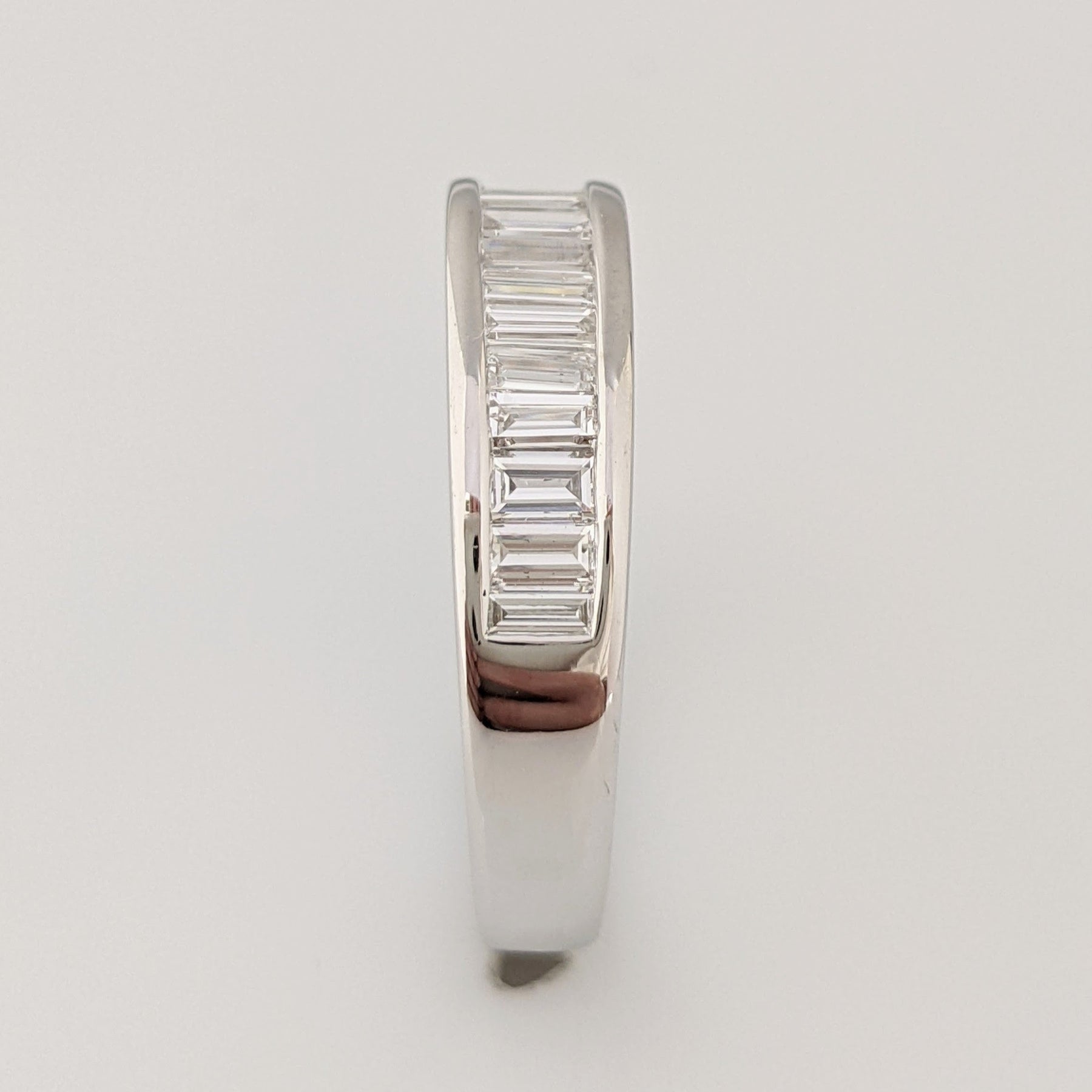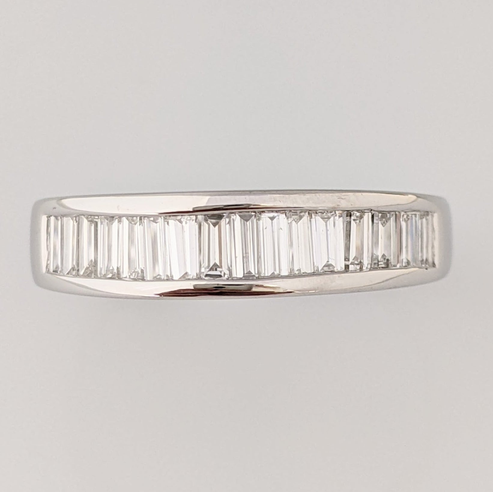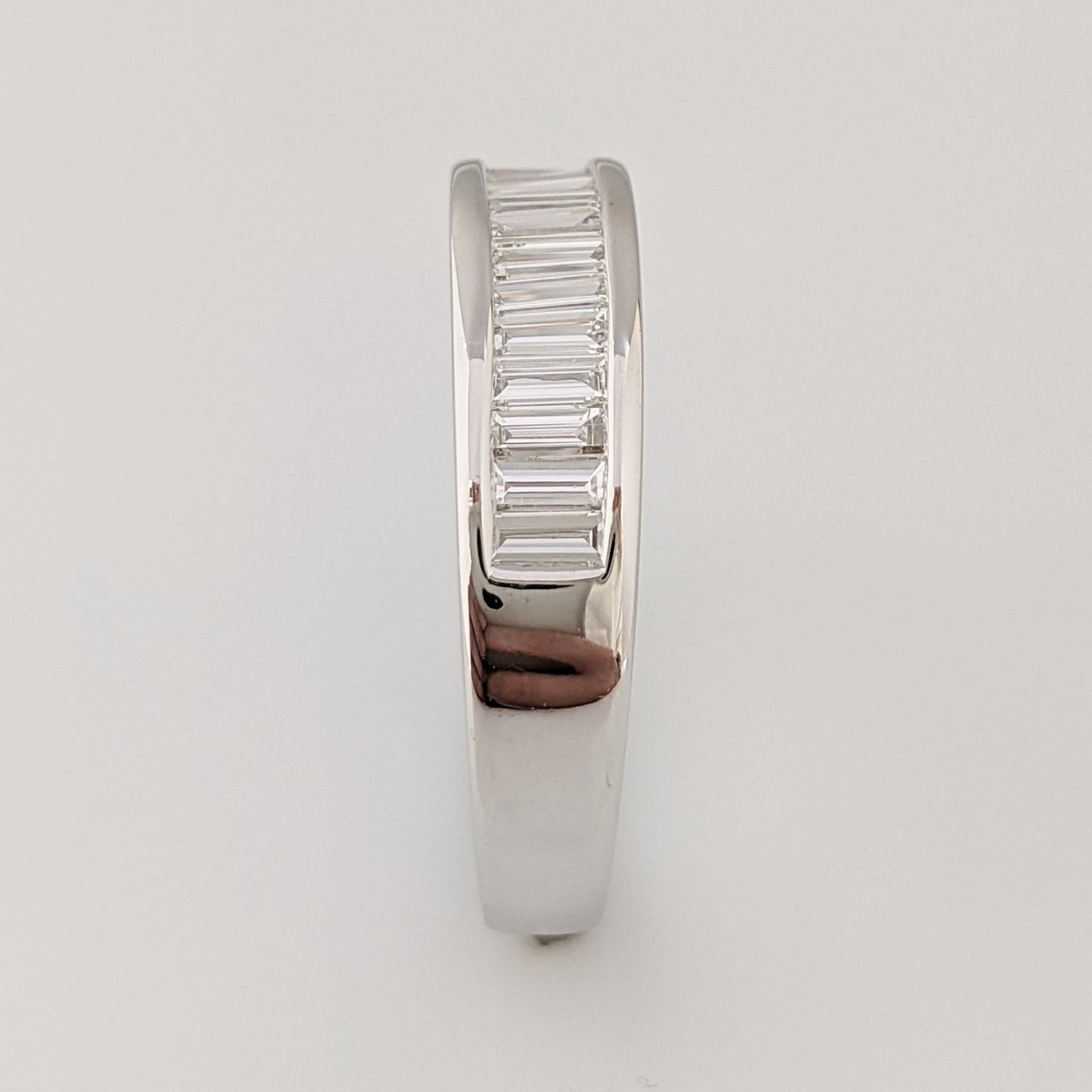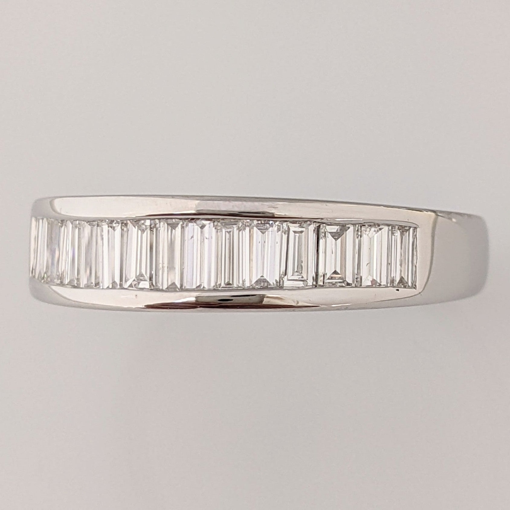 This 14k white gold estate ring contains (16) channel set baguette diamonds. This ring weighs 3.7 grams and is a size 11.