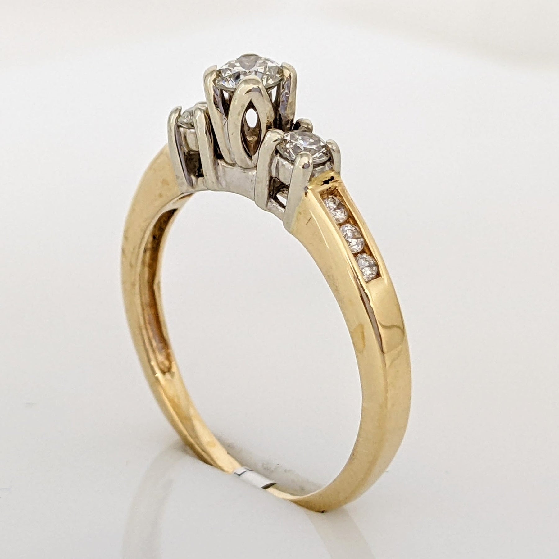 This 14K gold ring has a .37 carat total weight of 9 I1 J diamonds set in a trinity design. This high-quality ring has a total weight of 2.8 grams.