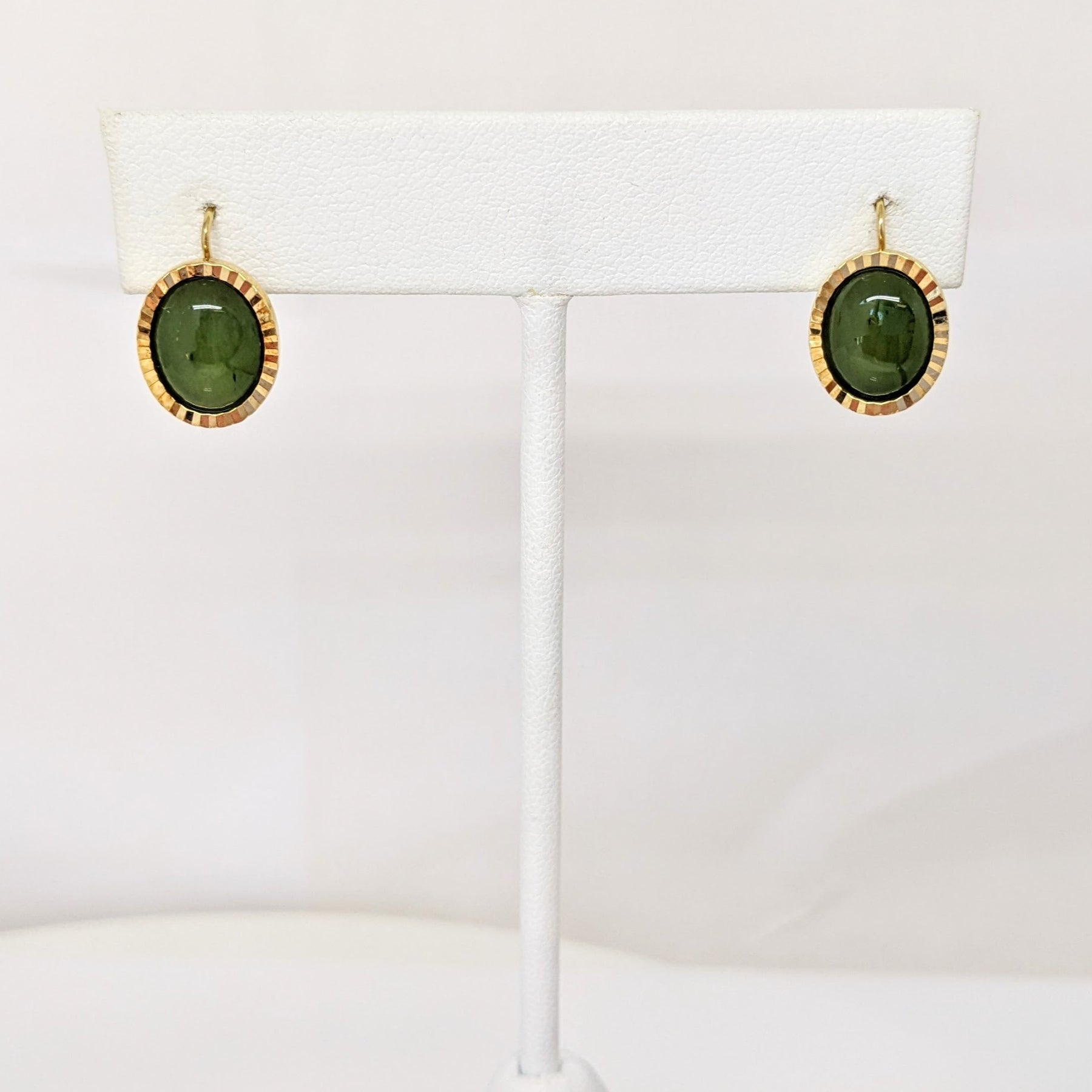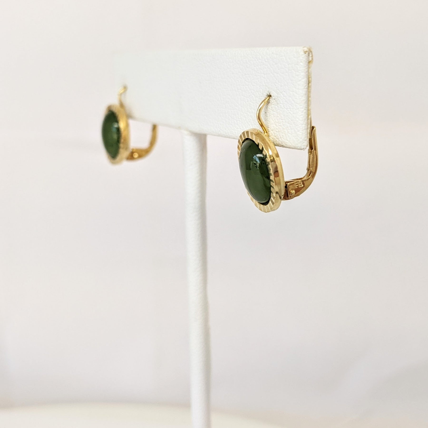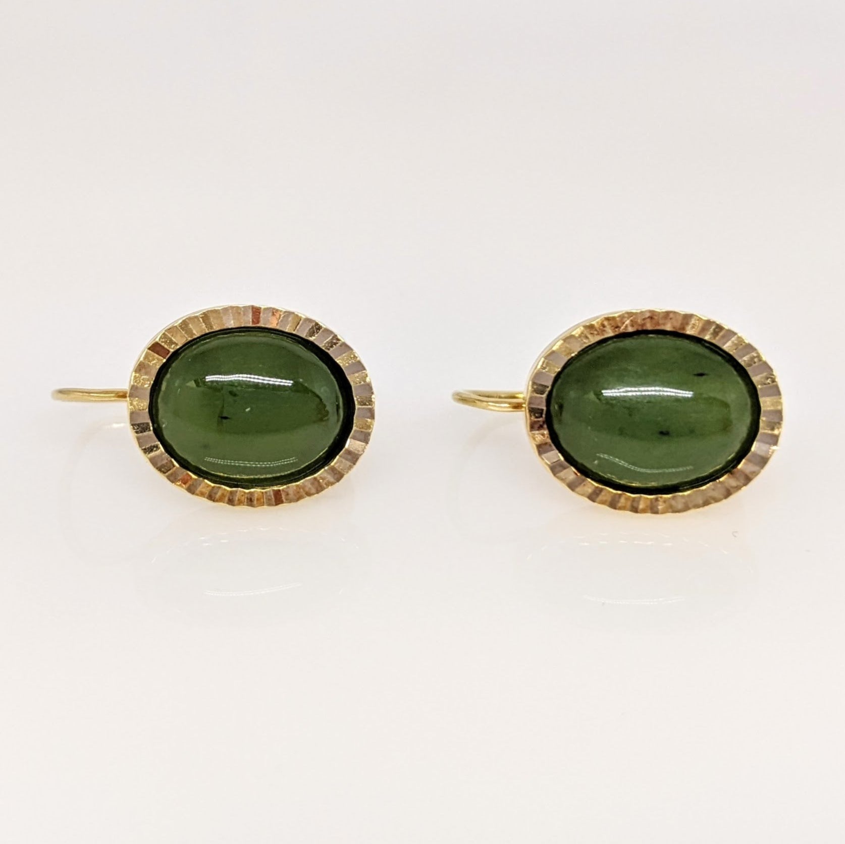 14K JADE OVAL 7X9 GOLD TRIM LEVER BACK EARRINGS ESTATE 3.4 GRAMS