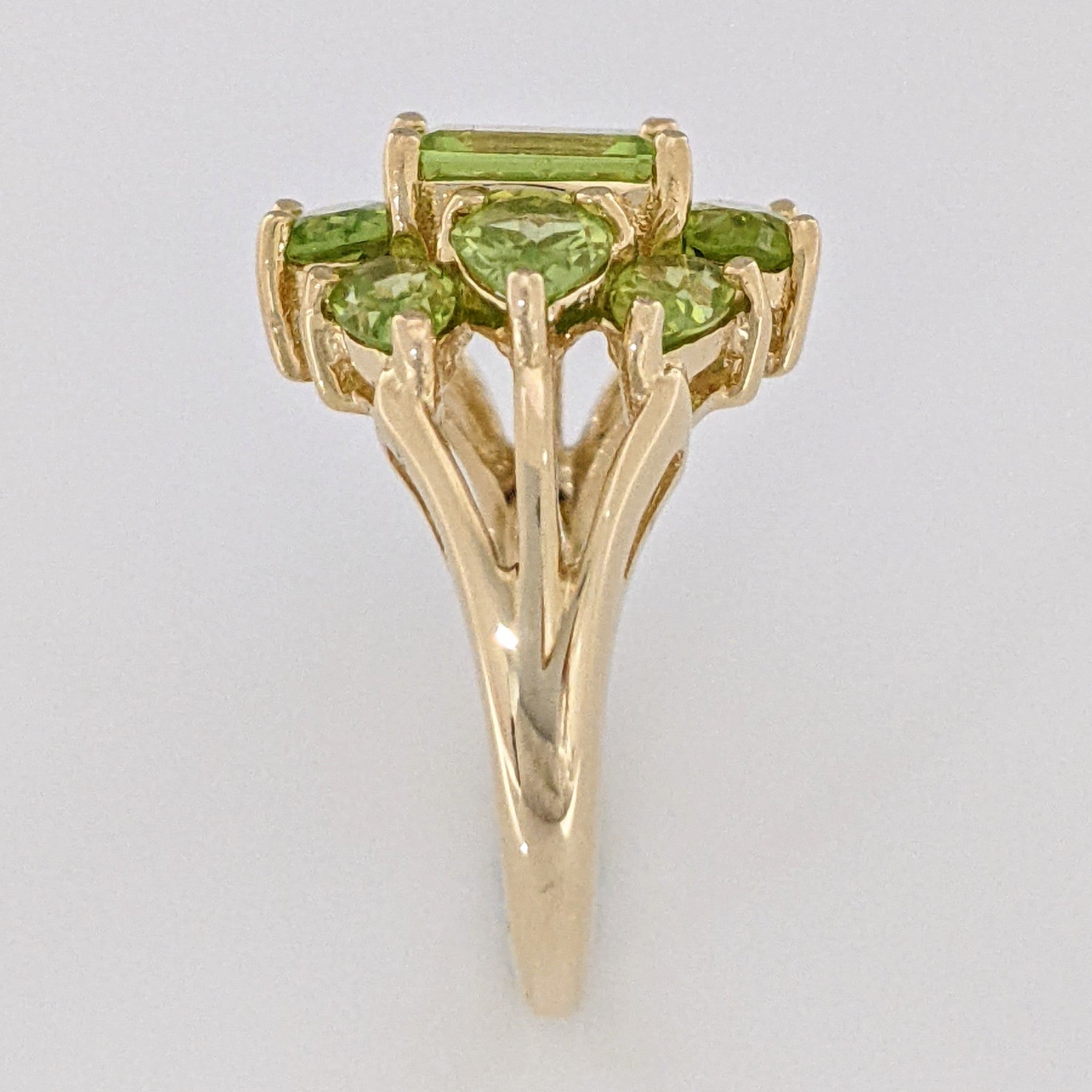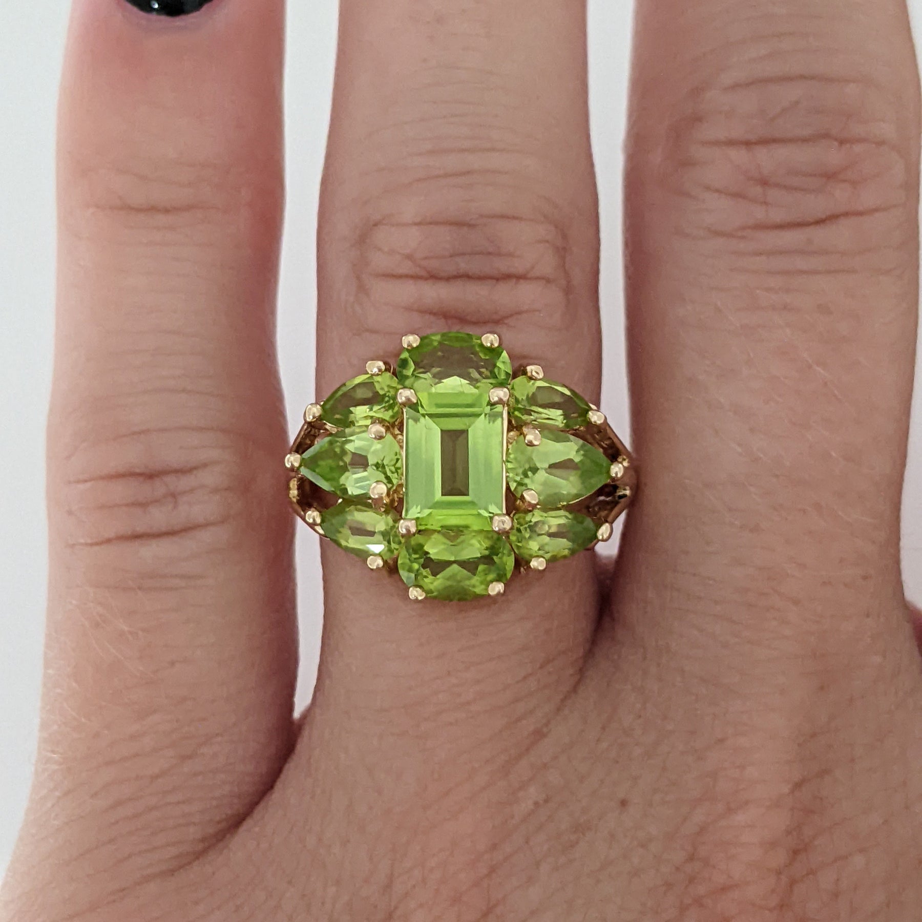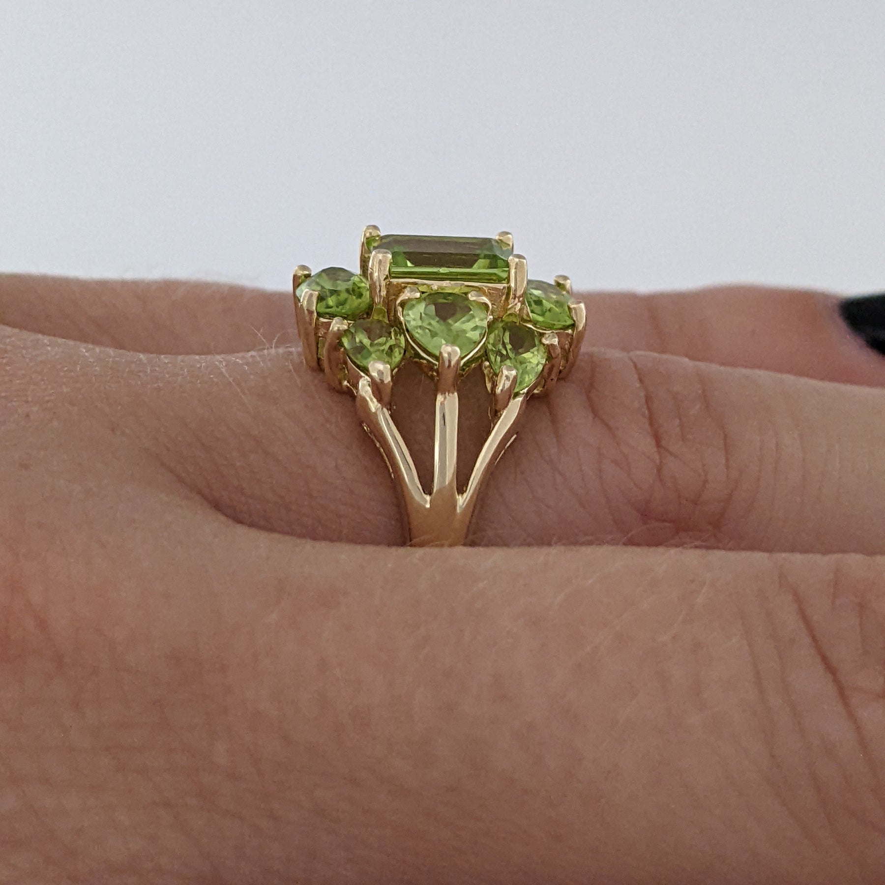 14k estate peridot ring. The ring contains one 5x7 emerald cut, two ovals, and three pear shape stones. The ring weighs 4.5 grams