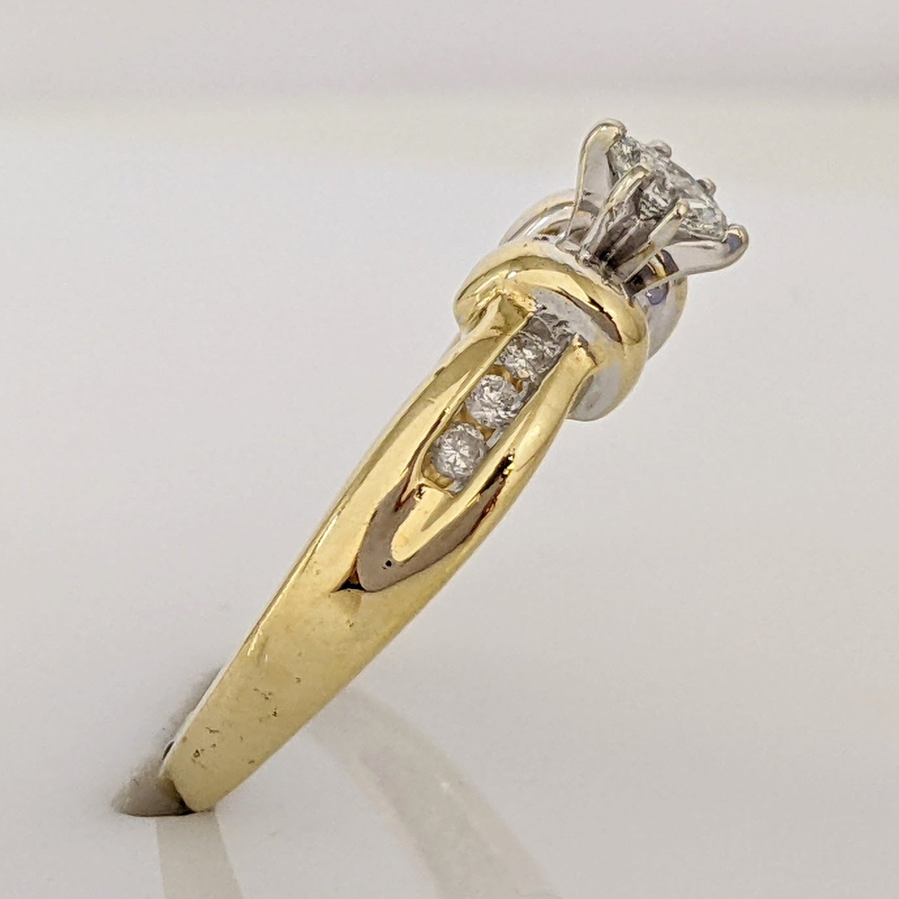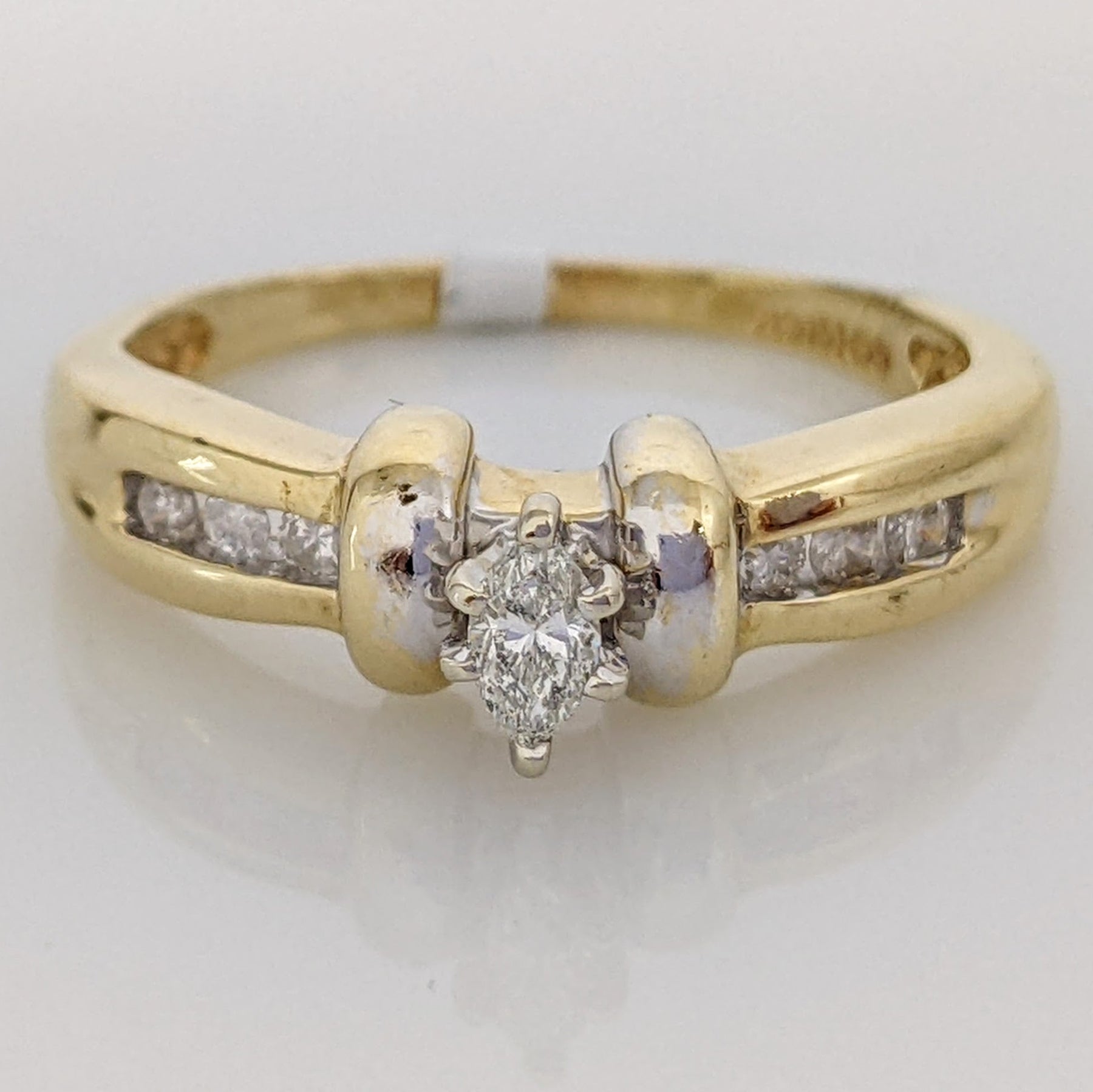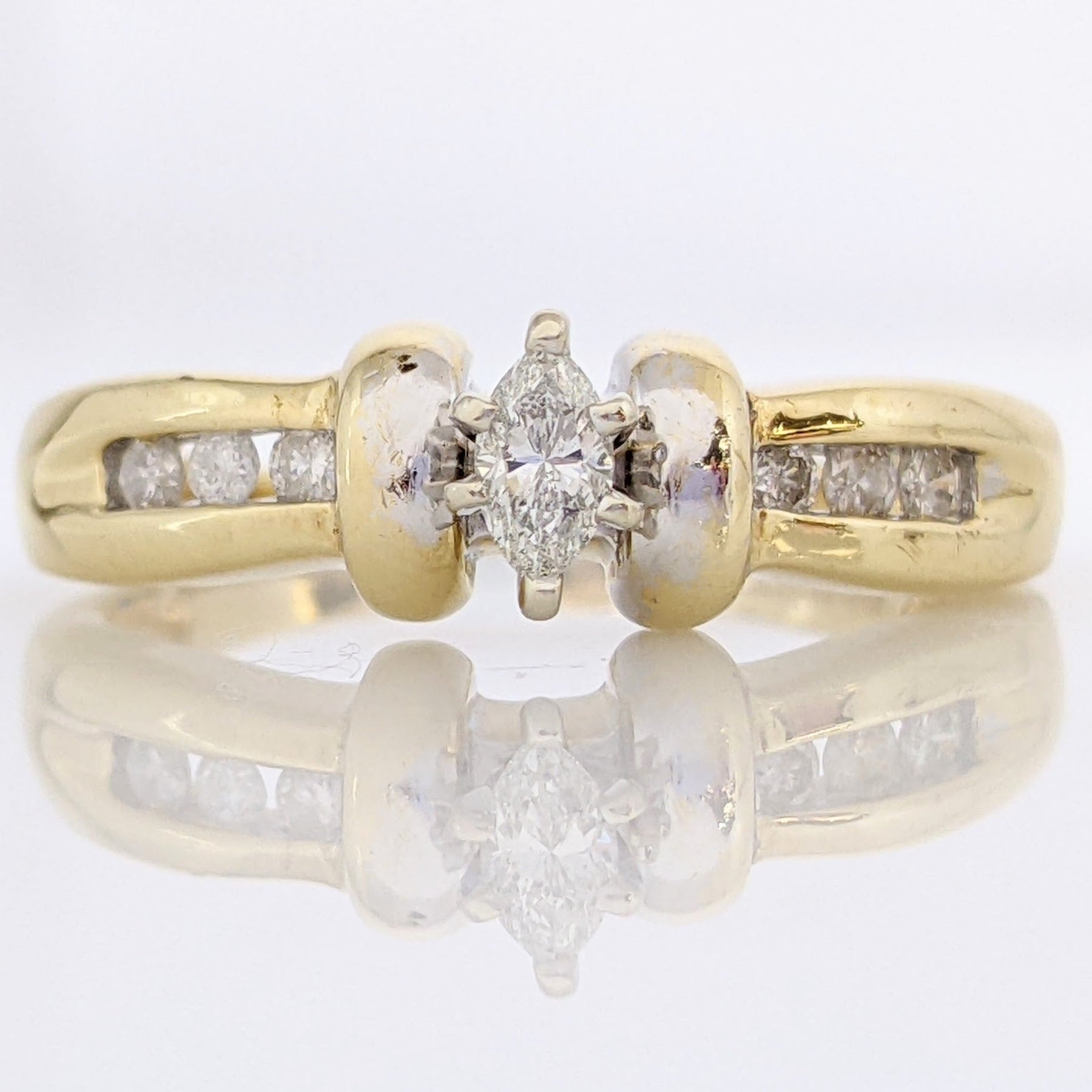 Present her with this stunning 14K yellow gold estate ring featuring a .24ct I1 I diamond marquise cut enhanced by 6 dazzling round diamonds. The ring weighs 3.7 grams.