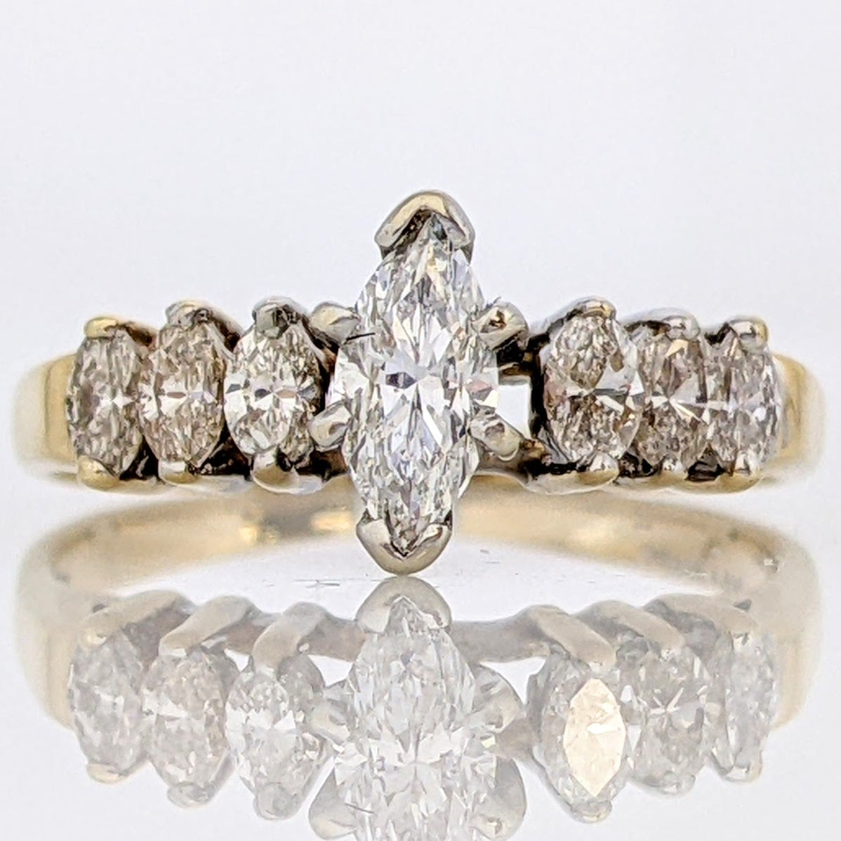 This estate ring features a unique 14K gold band with seven marquise-cut diamonds weighing a total of 0.53 carats, and an I1-G to I diamond color. Expertly crafted with 2.3 grams of gold, it's an elegant statement piece.