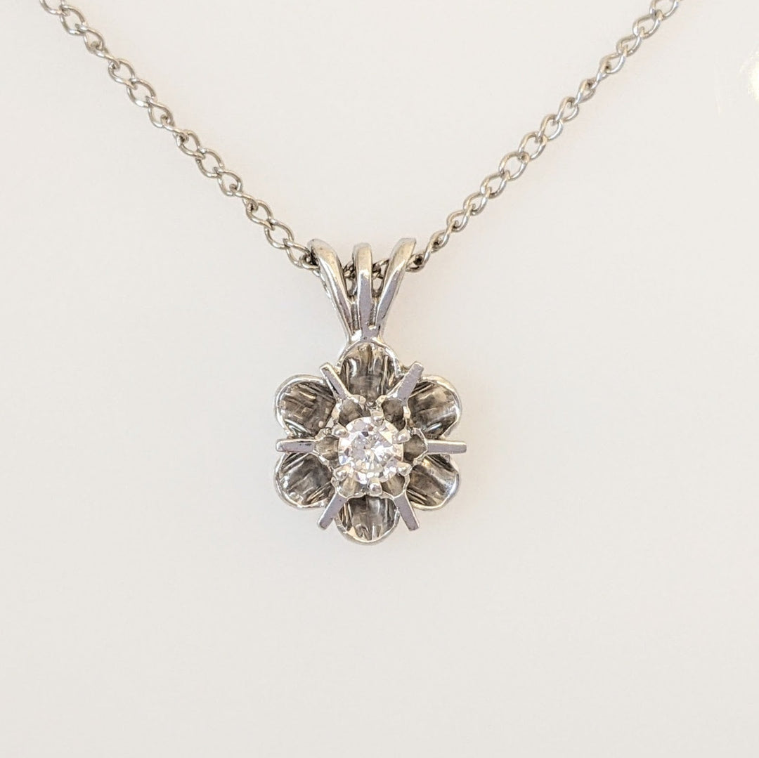 14K WHITE .07 CARAT TOTAL SI1 H DIAMOND ROUND FLOWER ESTATE PENDANT & CHAIN 1.9 GRAMS