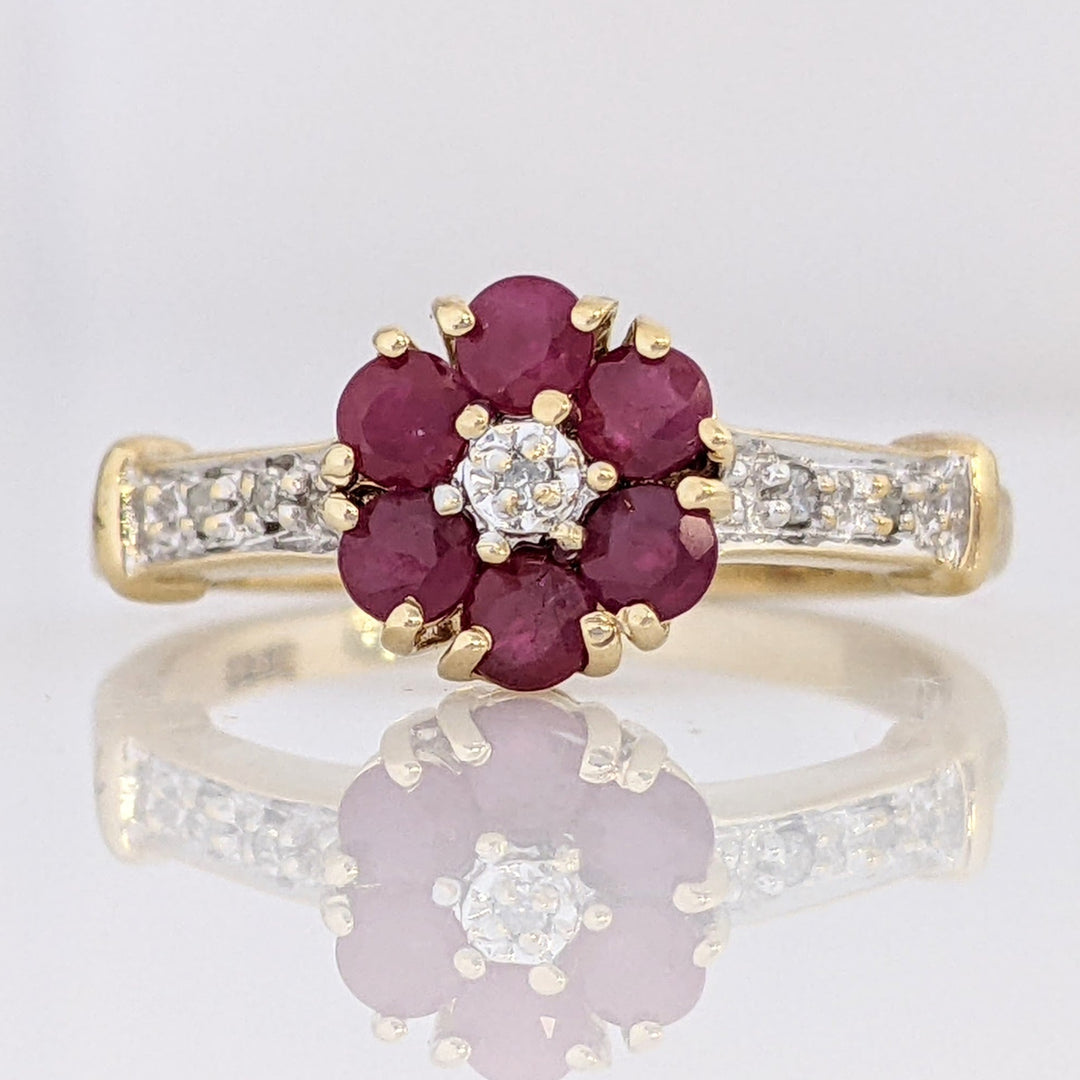10K RUBY ROUND (6) 2.5MM WITH (5) MELEE ESTATE RING 2.3 GRAMS