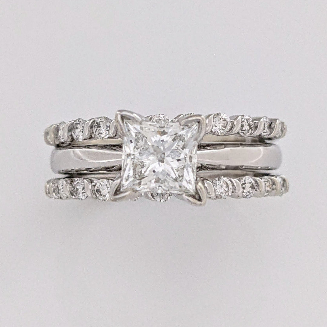 14K WHITE 1.50 CARAT TOTAL WEIGHT I1 H DIAMOND PRINCESS CUT WITH (22) ROUND ESTATE RING/ BANDS SET 5.2 GRAMS