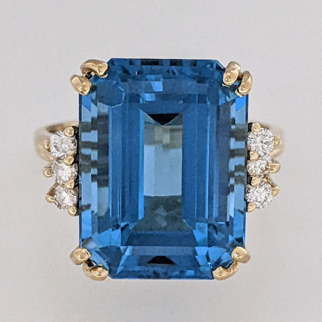 14K LONDON BLUE TOPAZ EMERALD CUT 12X16 WITH (6) MELEE ESTATE RING 6.9 GRAMS