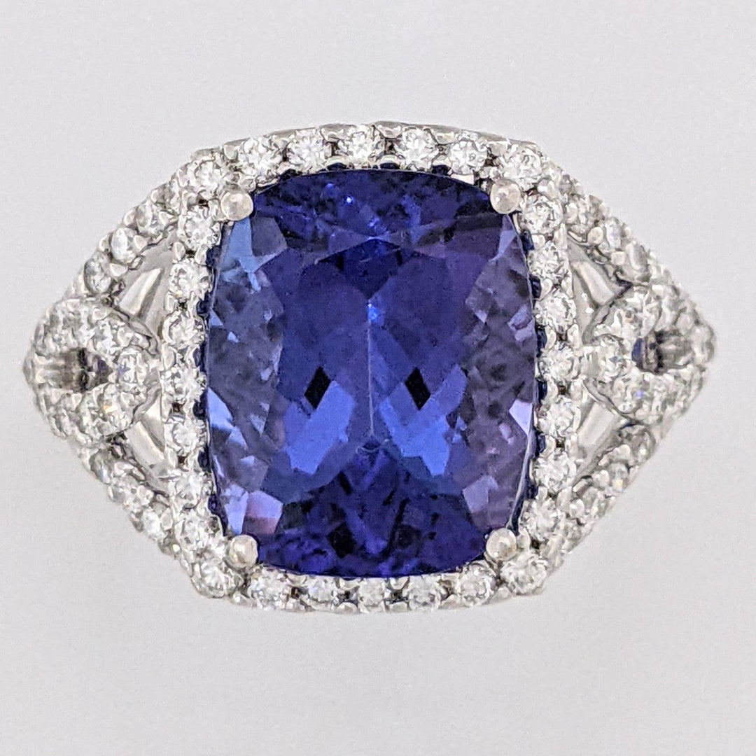 14K WHITE TANZANITE "AA" CUSHION CUT 9X11 WITH .52 DIAMOND TOTAL WEIGHT ESTATE RING 5.3 GRAMS