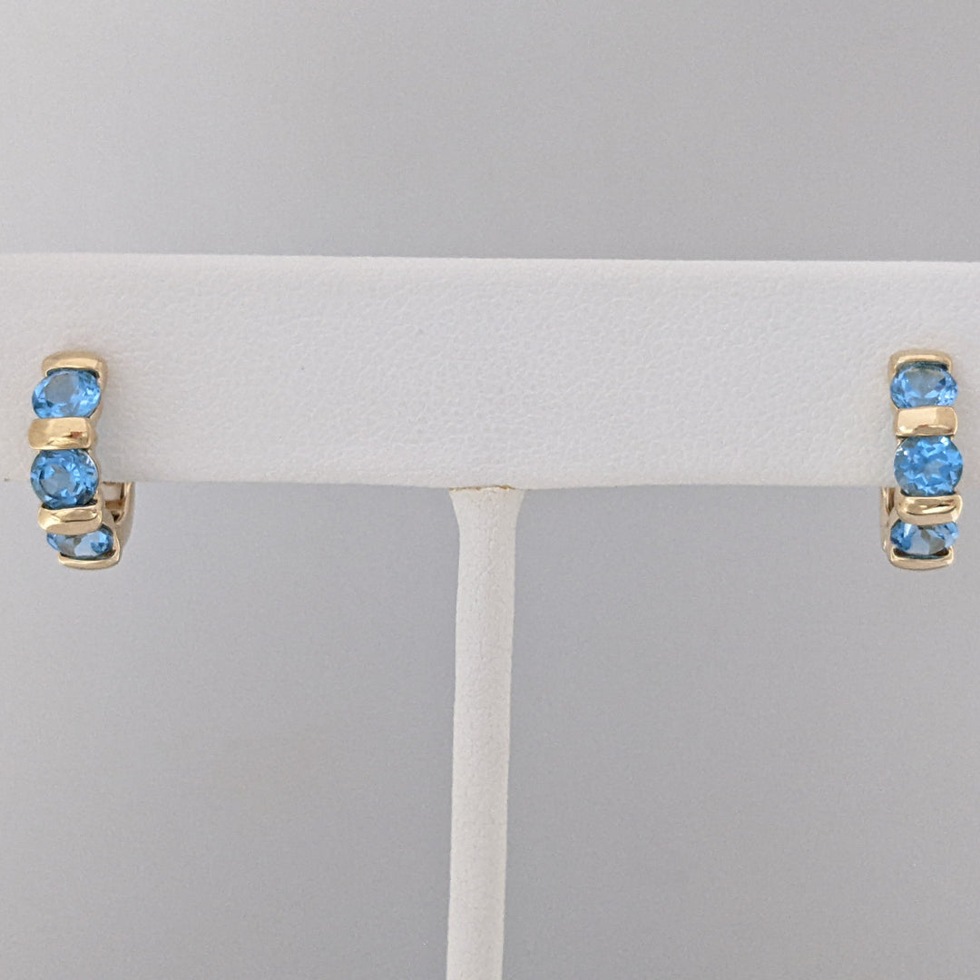 14K BLUE TOPAZ ROUND (6) 4MM BAR SET ESTATE HOOP EARRINGS 3.0 GRAMS