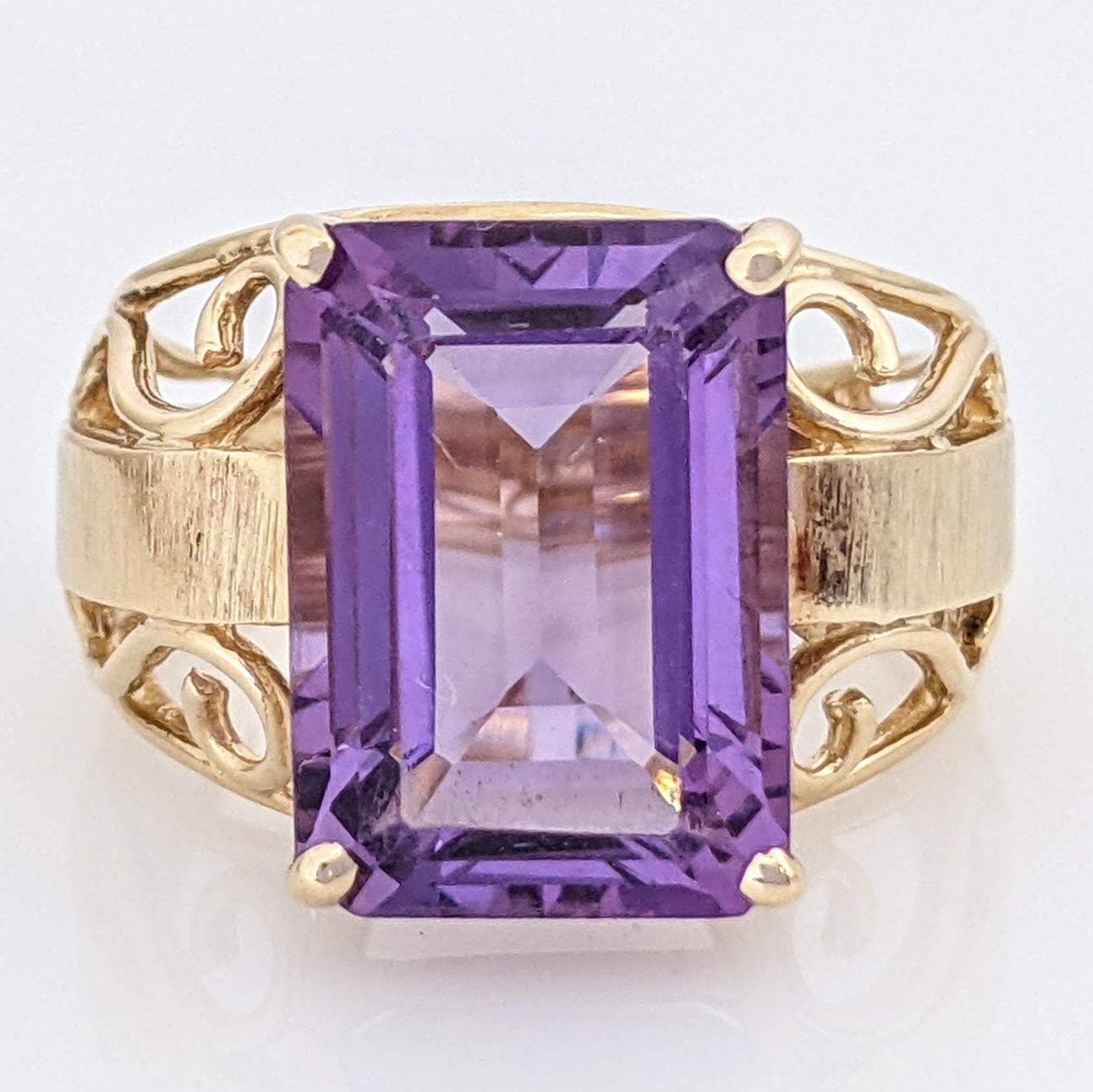 10K AMETHYST EMERALD CUT 10X14 OPEN TEXTURED SIDES ESTATE RING 5.7 GRAMS