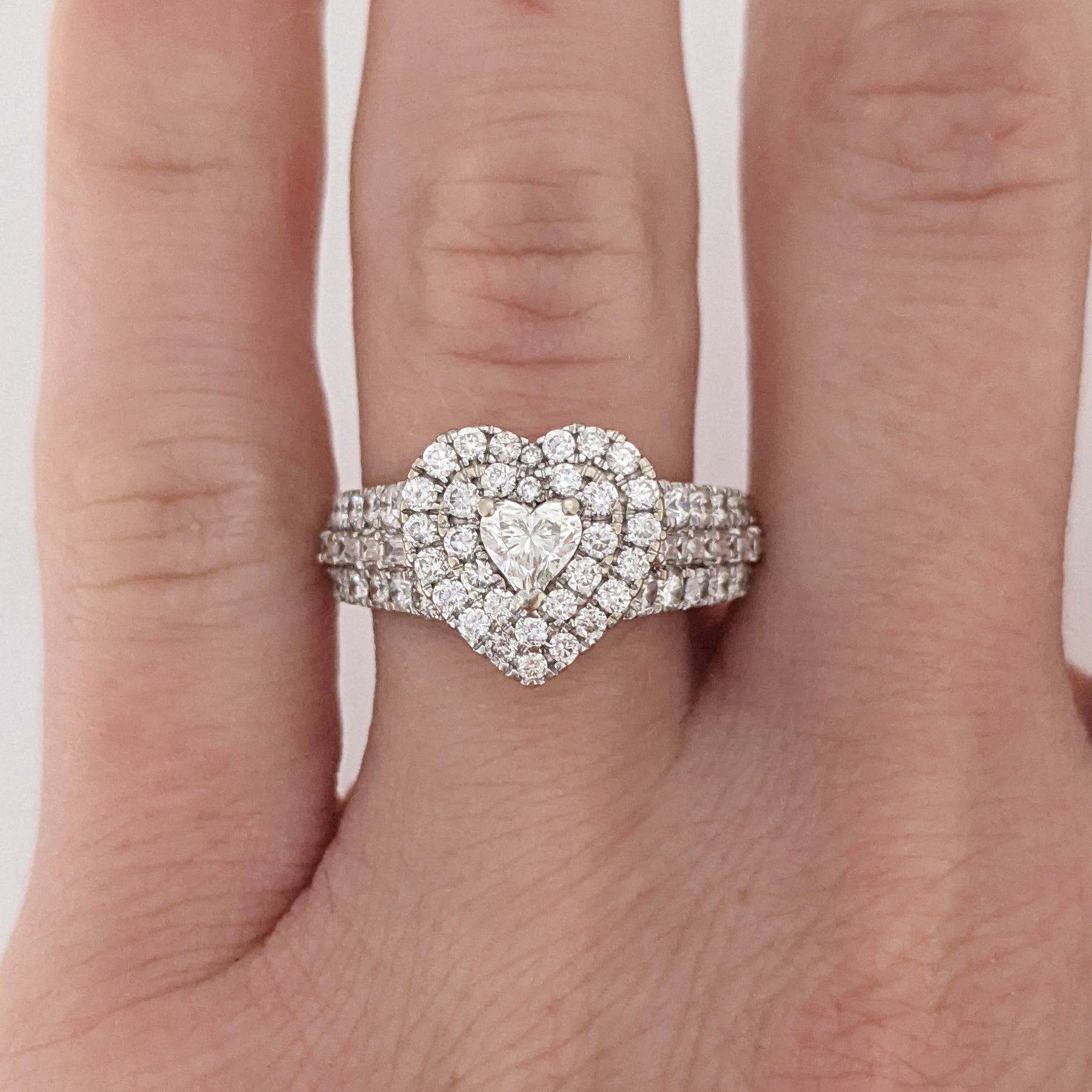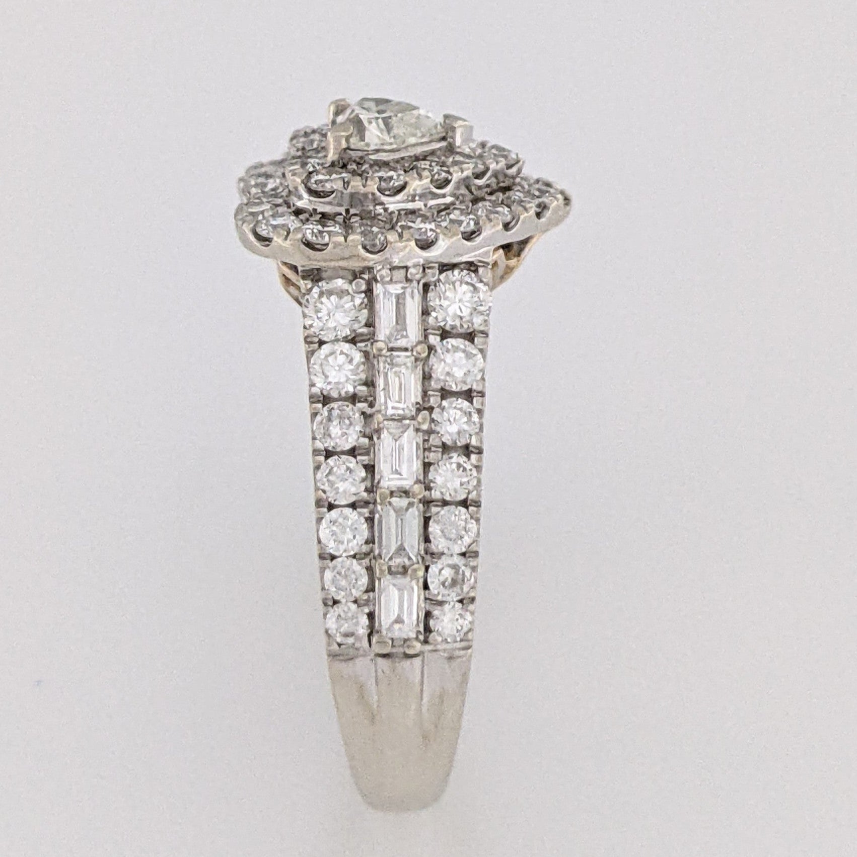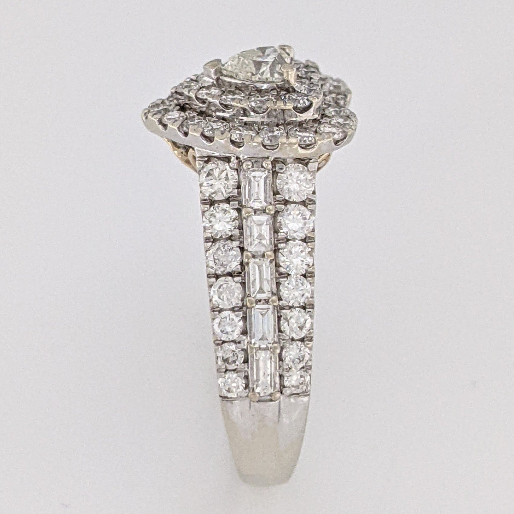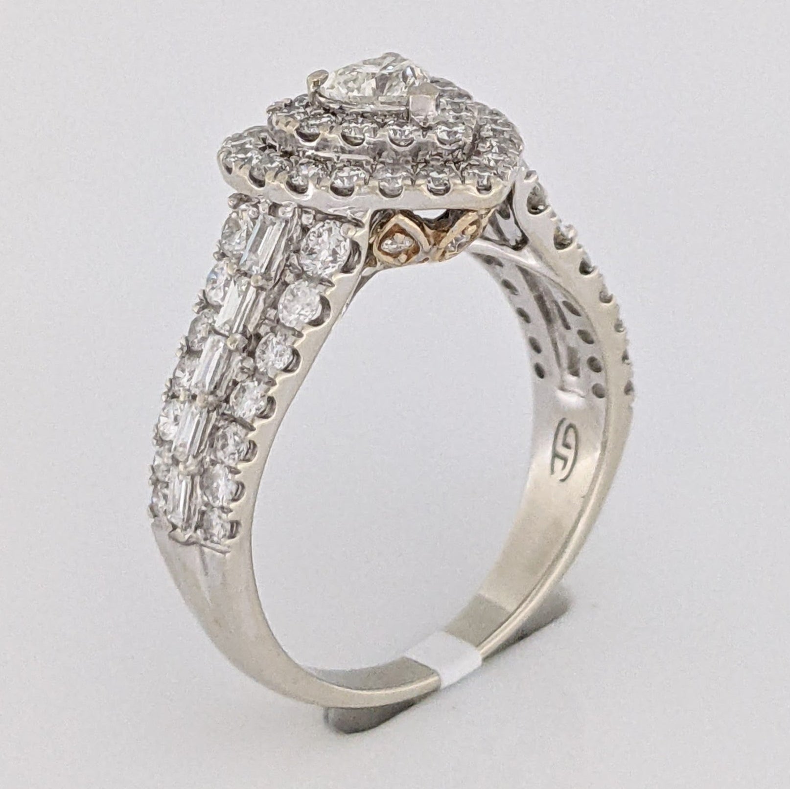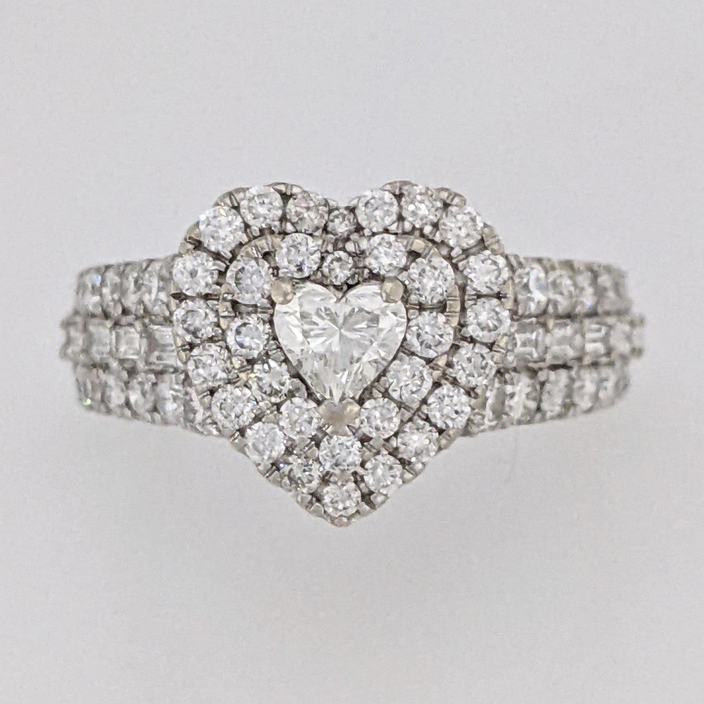 10K TWO-TONE 1.47 CARAT TOTAL WEIGHT SI1 I DIAMOND HEART (1) ROUND (66) BAGUETTE (10) ESTATE DOUBLE HALO RING 3.9 GRAMS