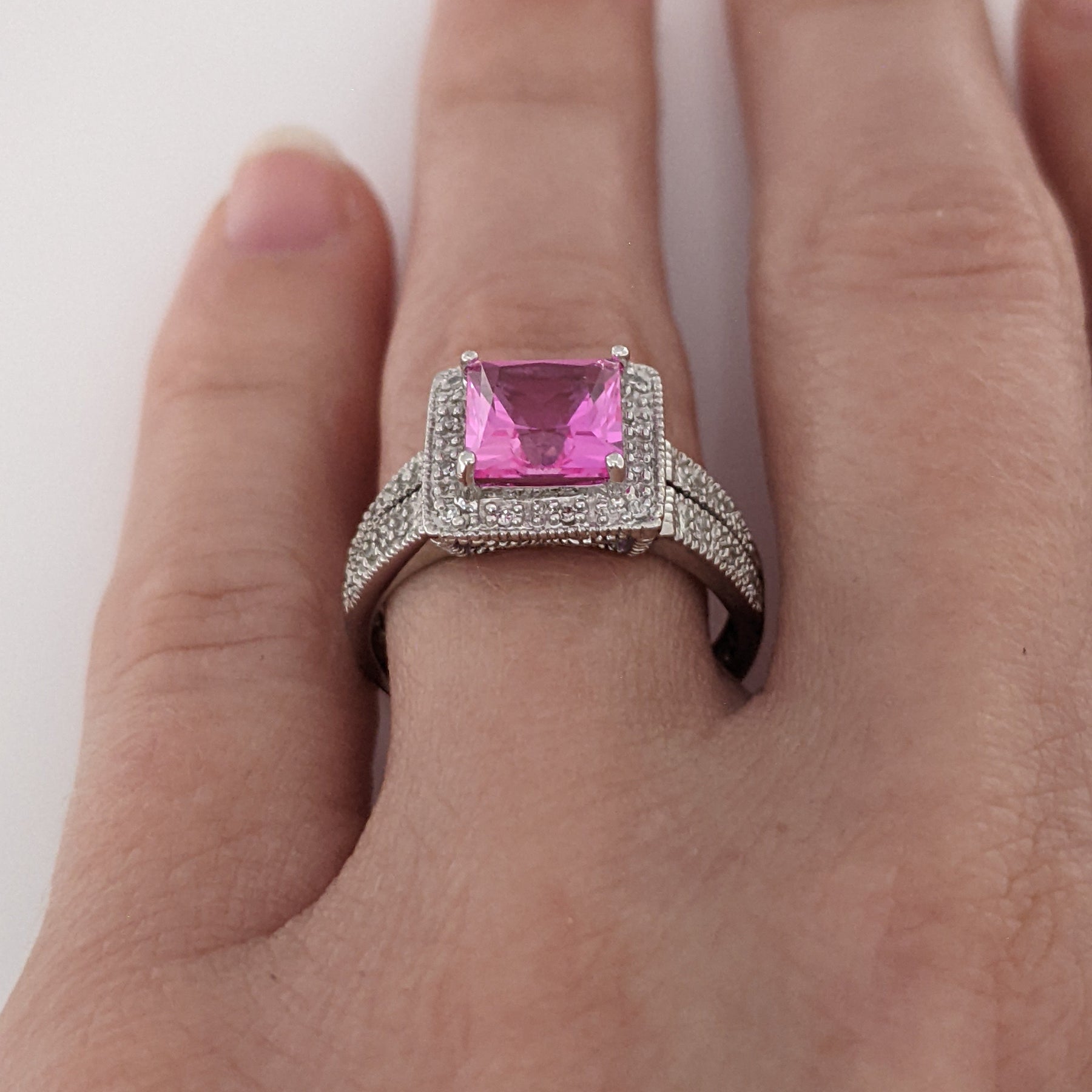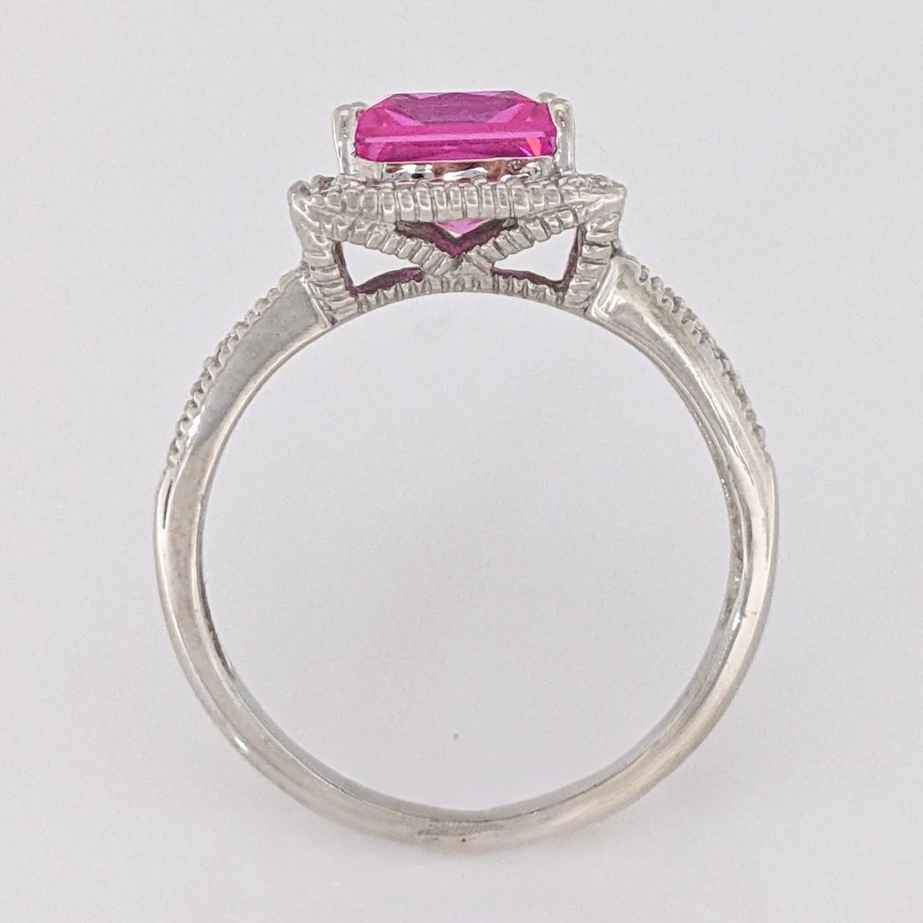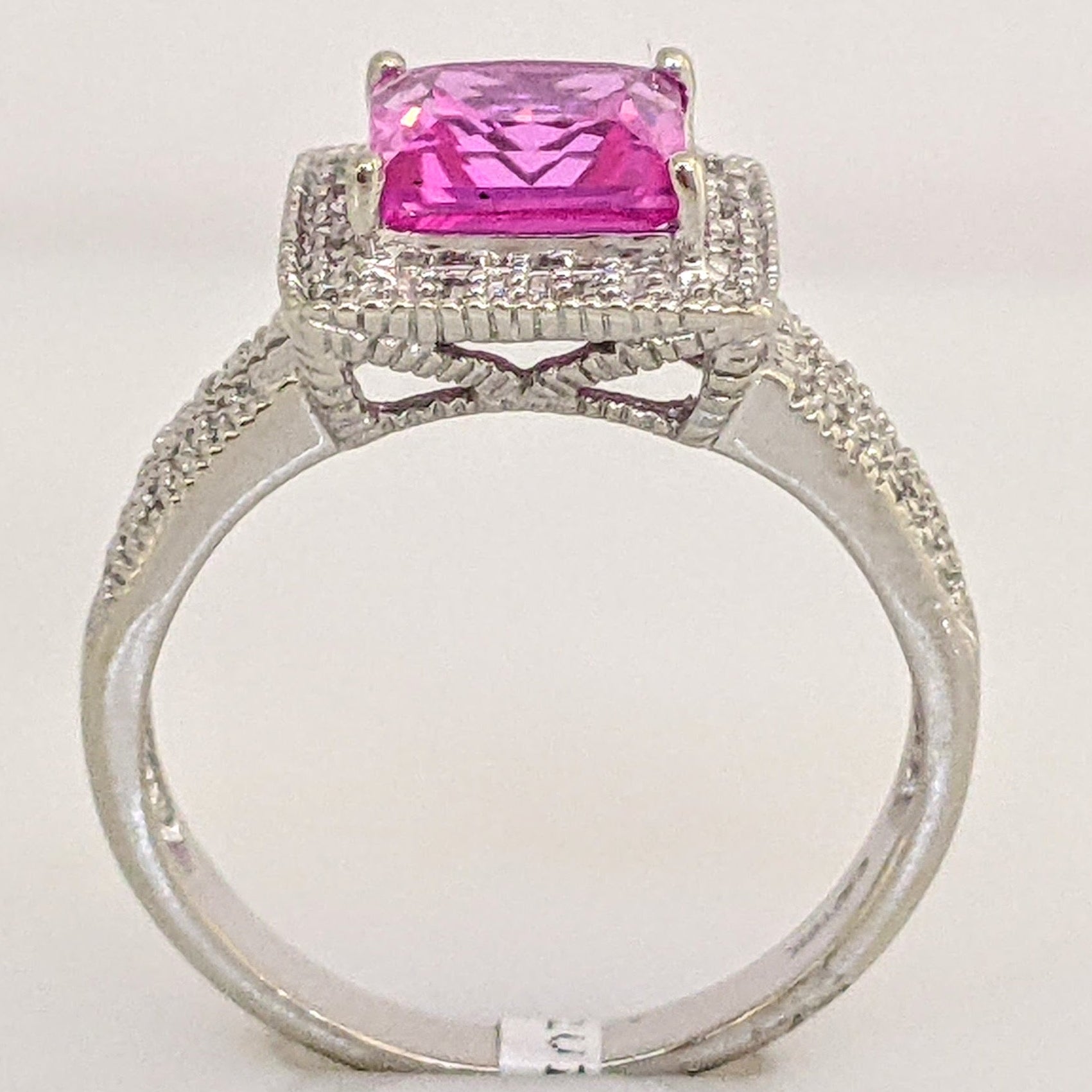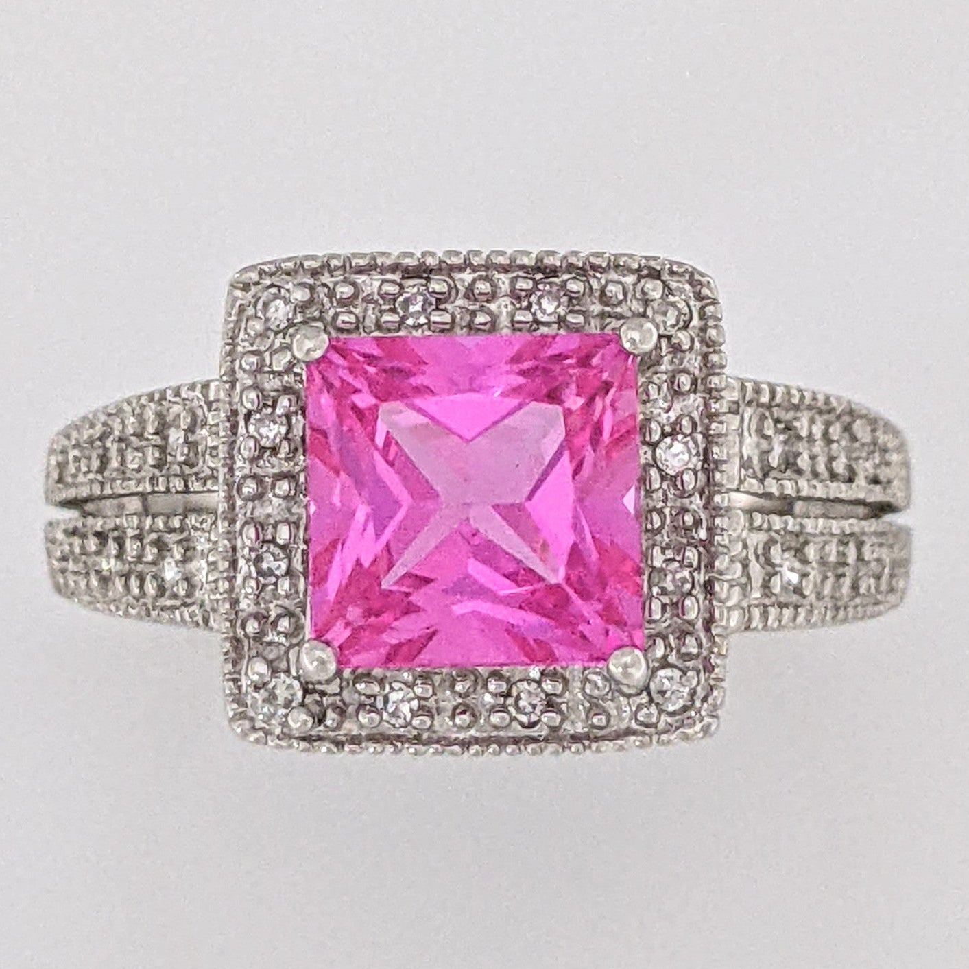 10K WHITE LAB-CREATED PINK SAPPHIRE PRINCESS CUT 7MM WITH .20 DIAMOND TOTAL WEIGHT ESTATE RING 3.4 GRAMS