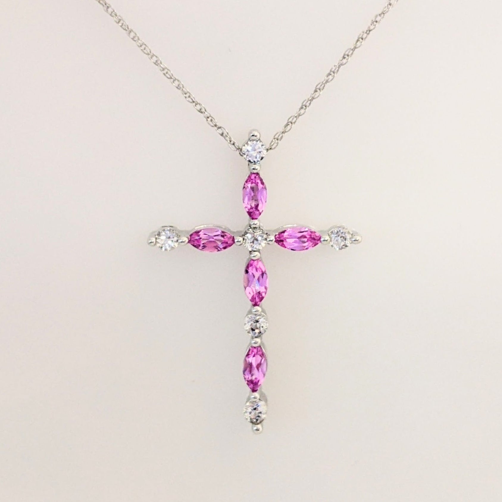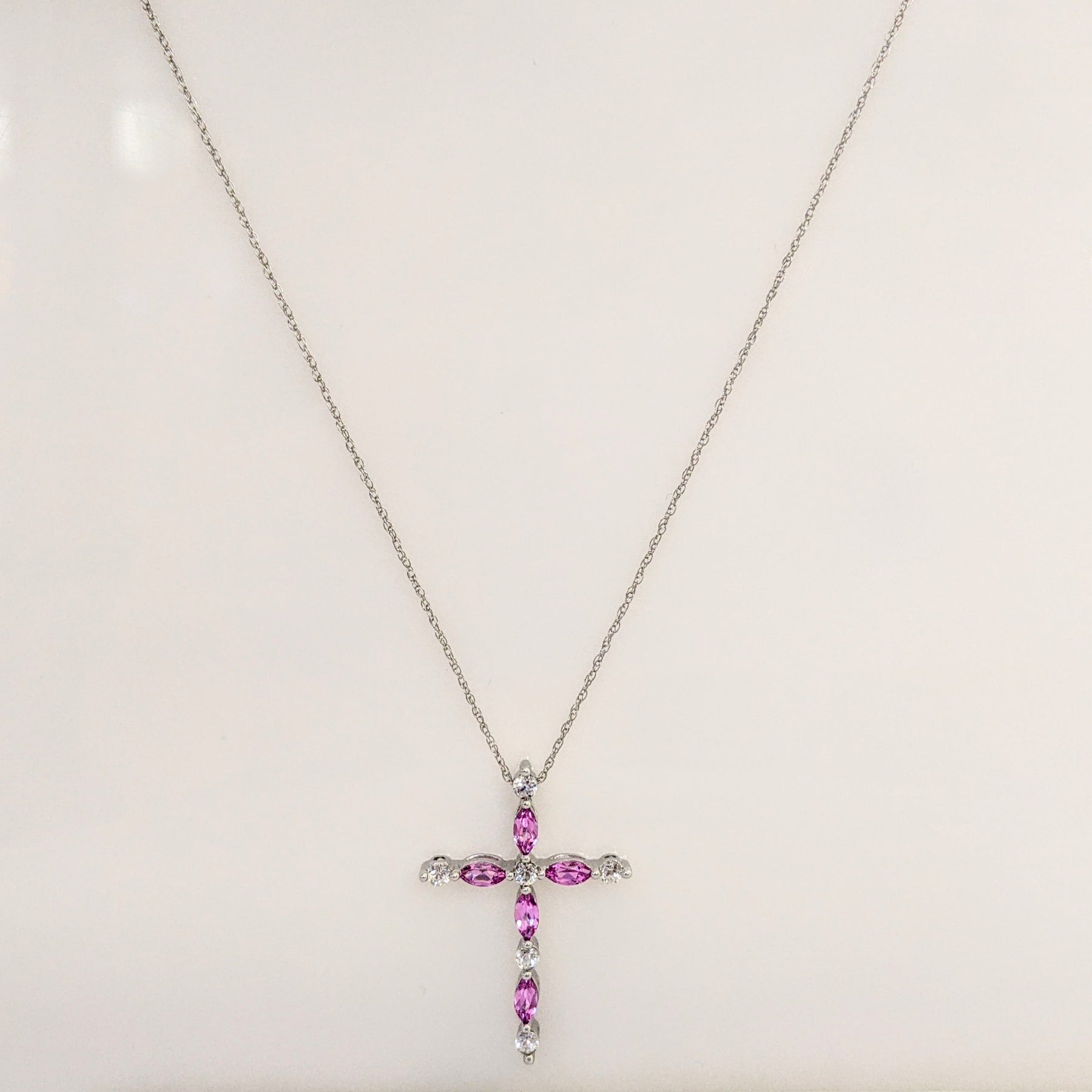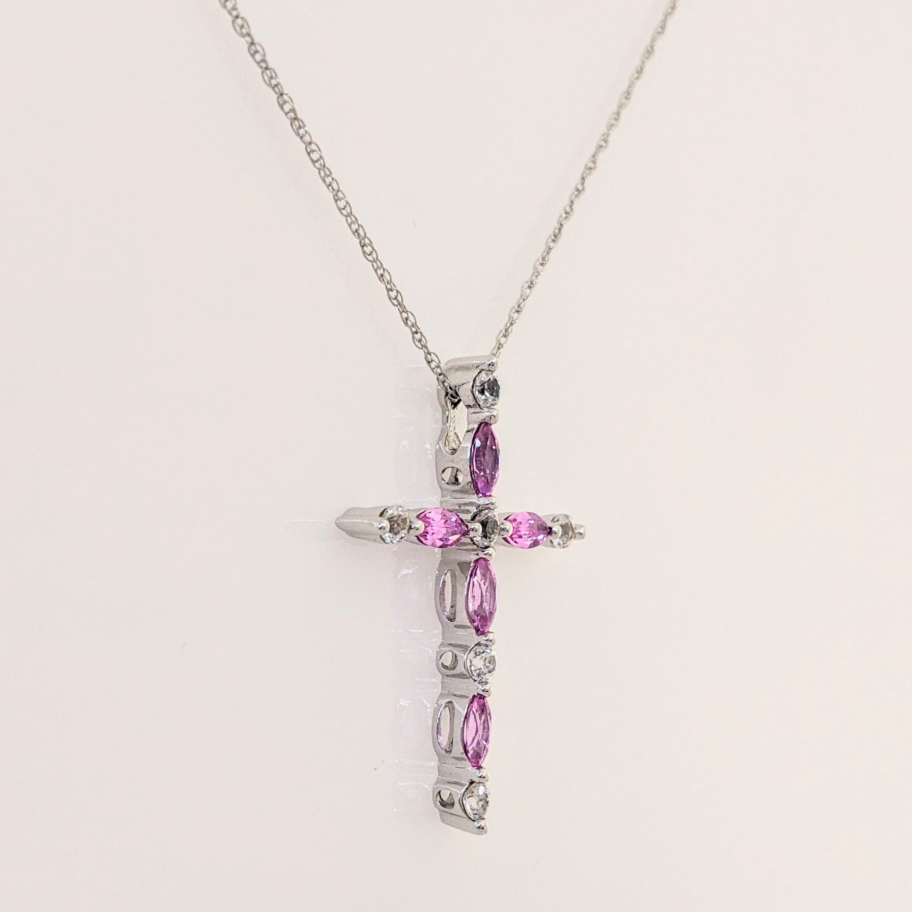 10K WHITE PINK/WHITE SAPPHIRE ESTATE CROSS PENDANT & CHAIN 2.7 GRAMS