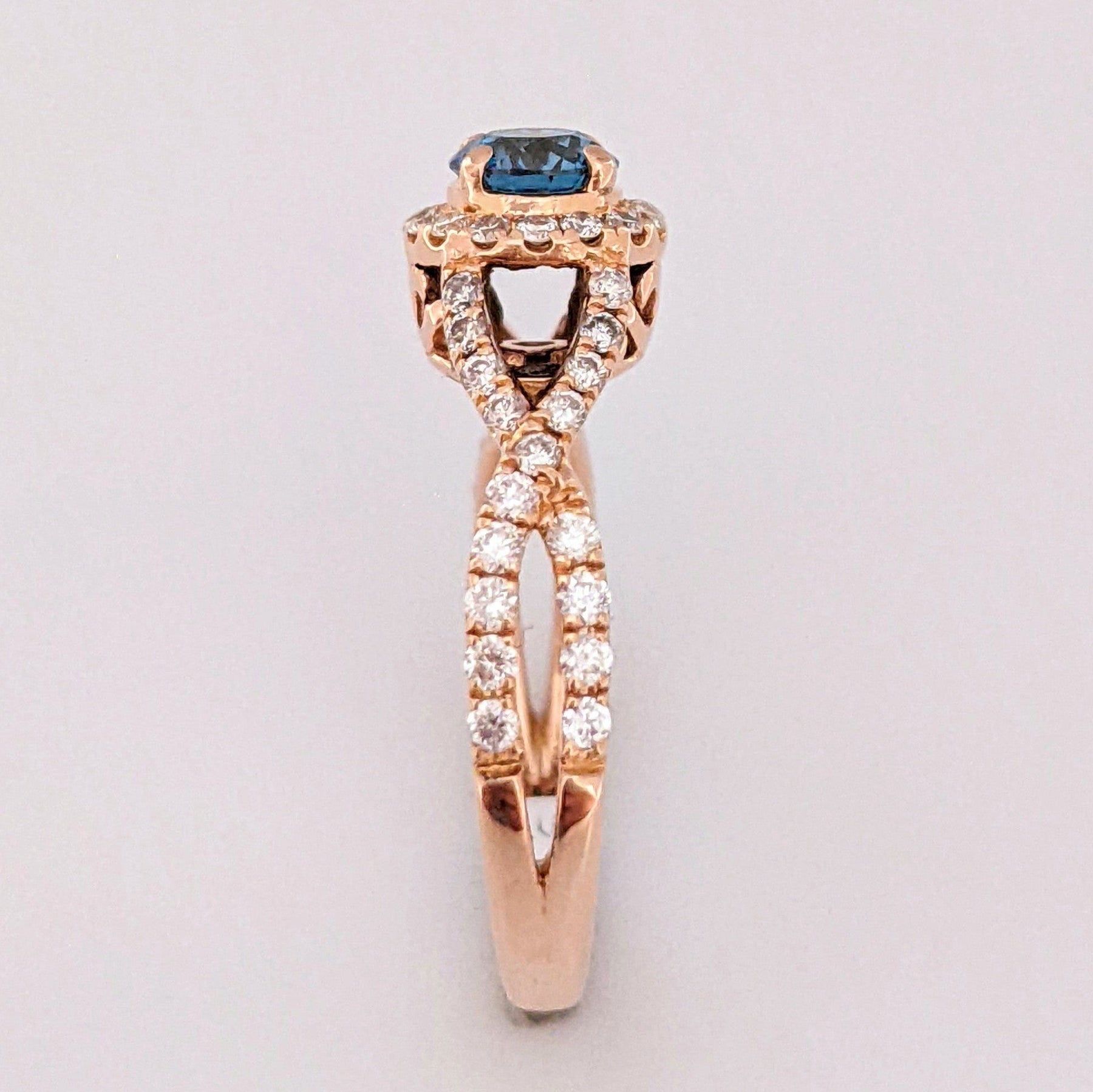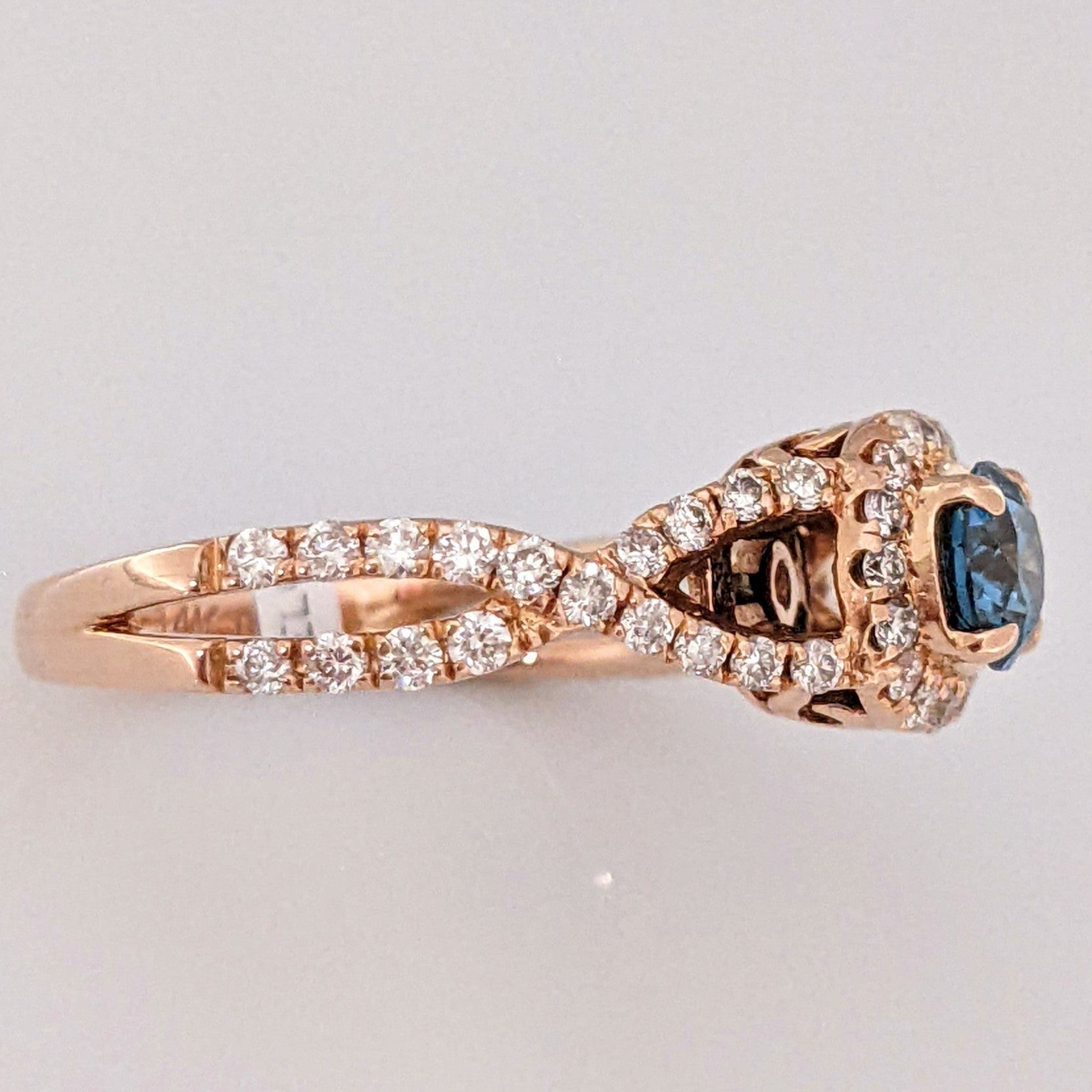 14K rose gold .97ctw diamond ring. The ring contains (32) round diamonds and (1) blue diamond center. The ring weighs 3.7 grams