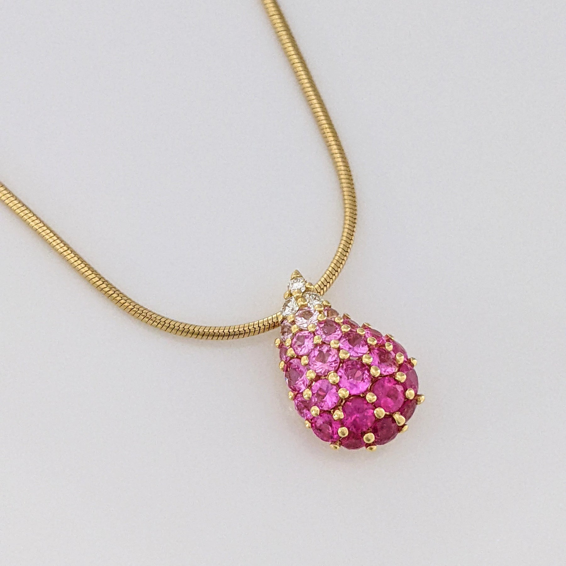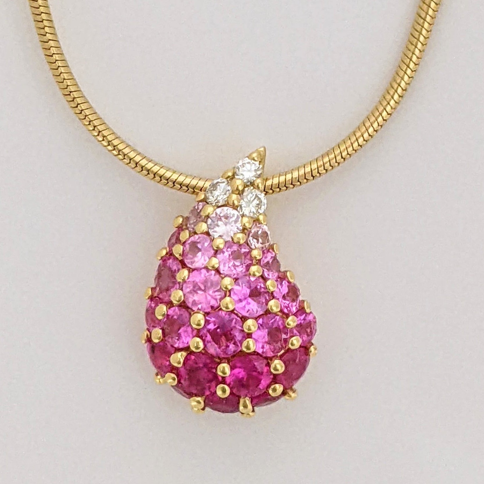18K PINK/ WHITE SAPPHIRE ROUND CLUSTER PEAR ESTATE PENDANT & CHAIN 7.7 GRAMS