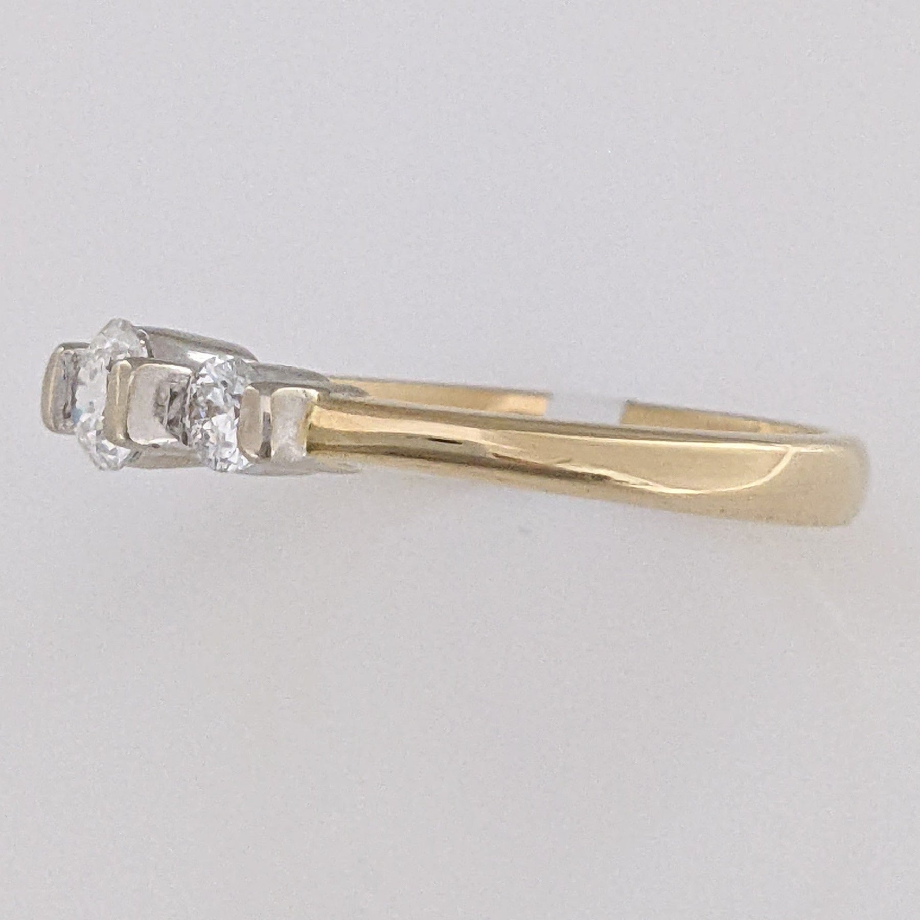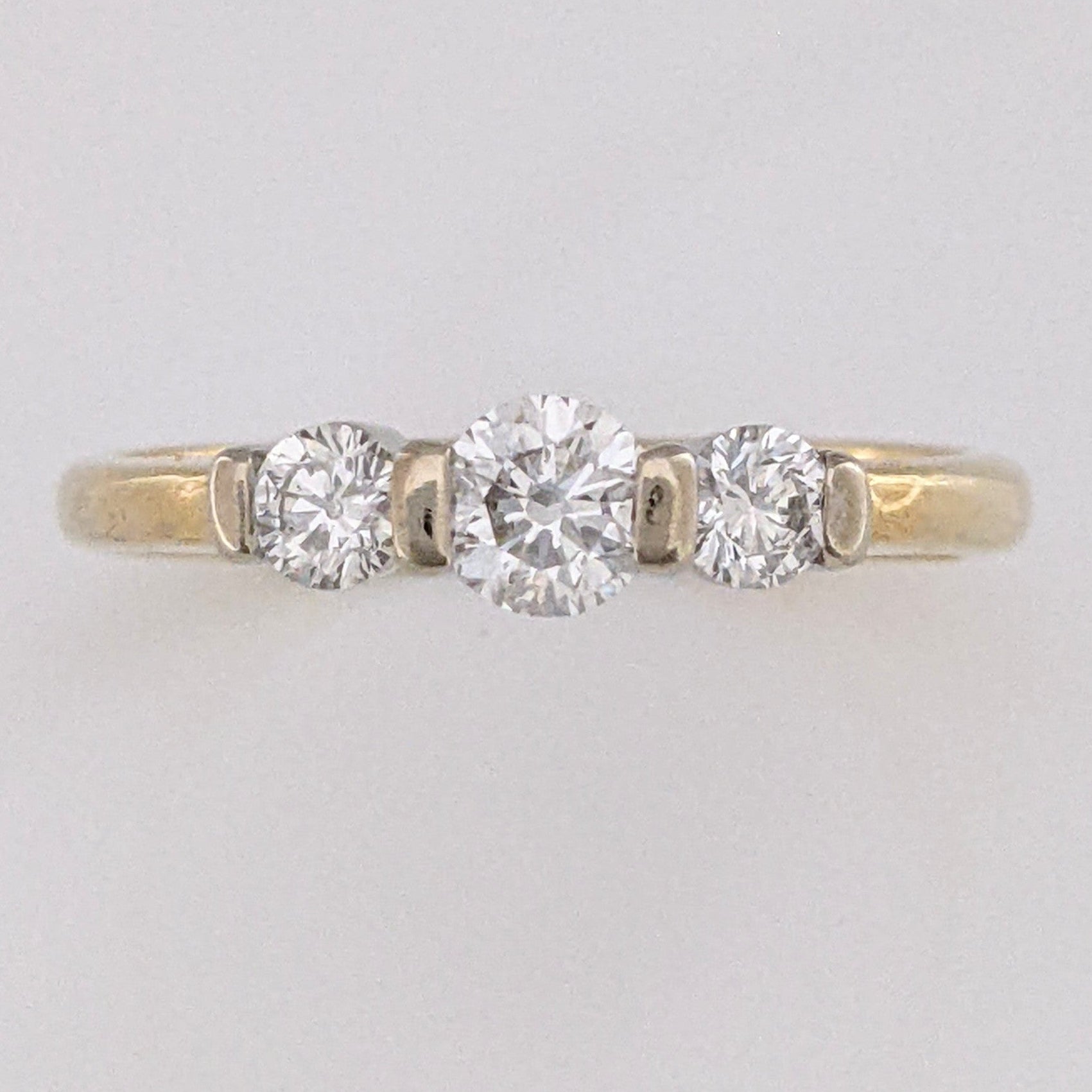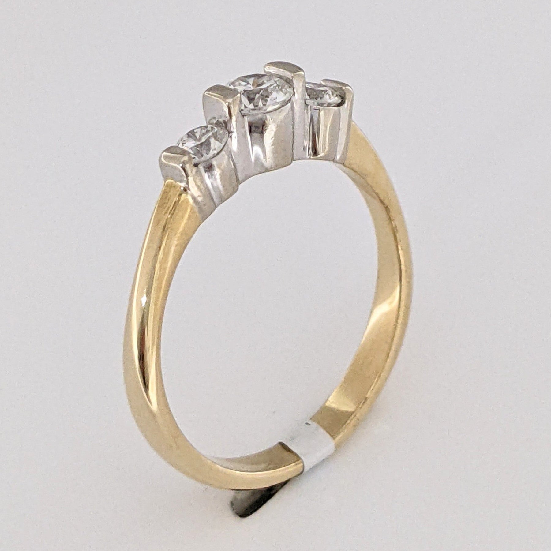 This beautiful 14K trinity estate ring features three round, bar-set diamonds at a total weight of 0.40 carats. Each diamond is SI2 clarity and H color, set in a 3.1-gram gold band. Perfect for a classic, timeless look.