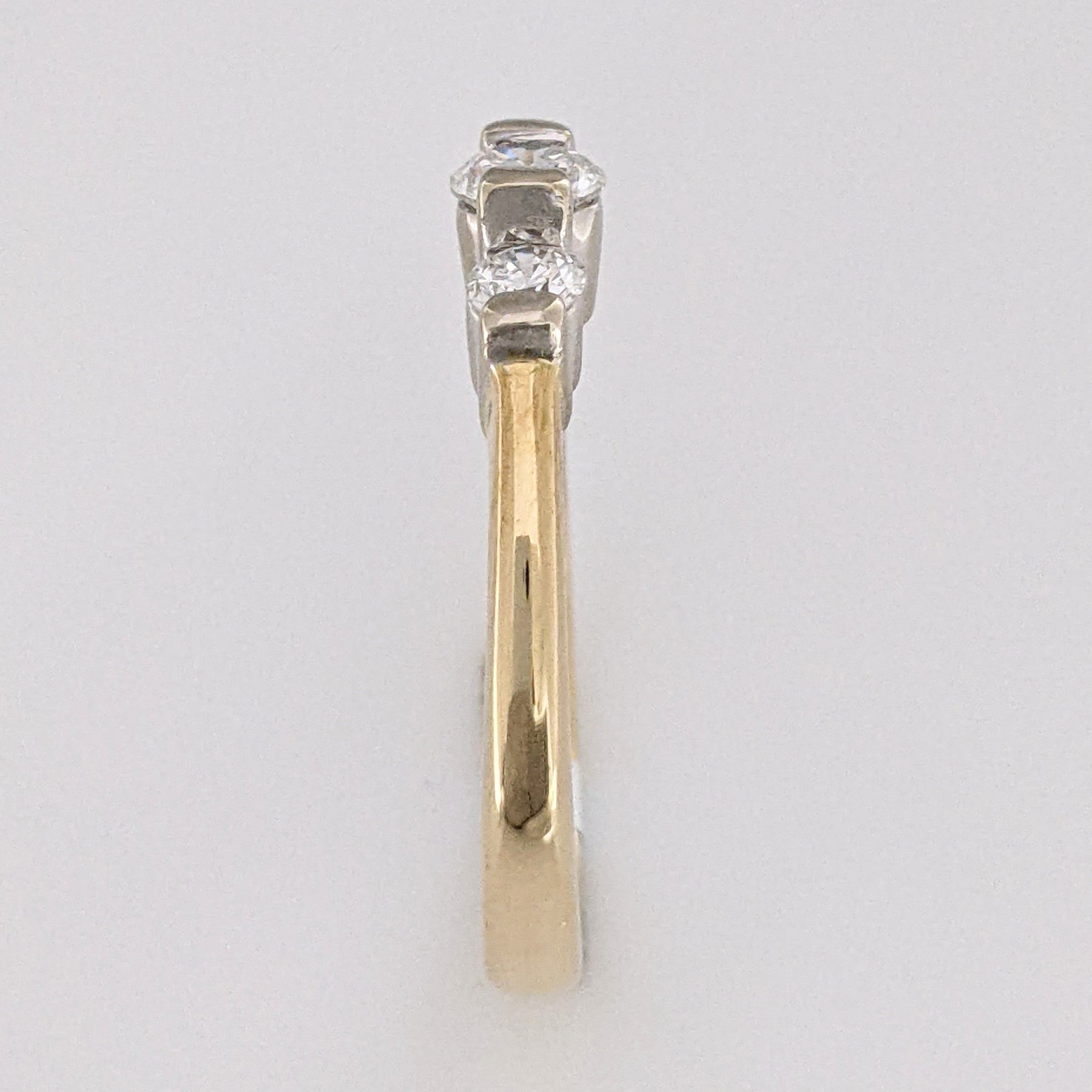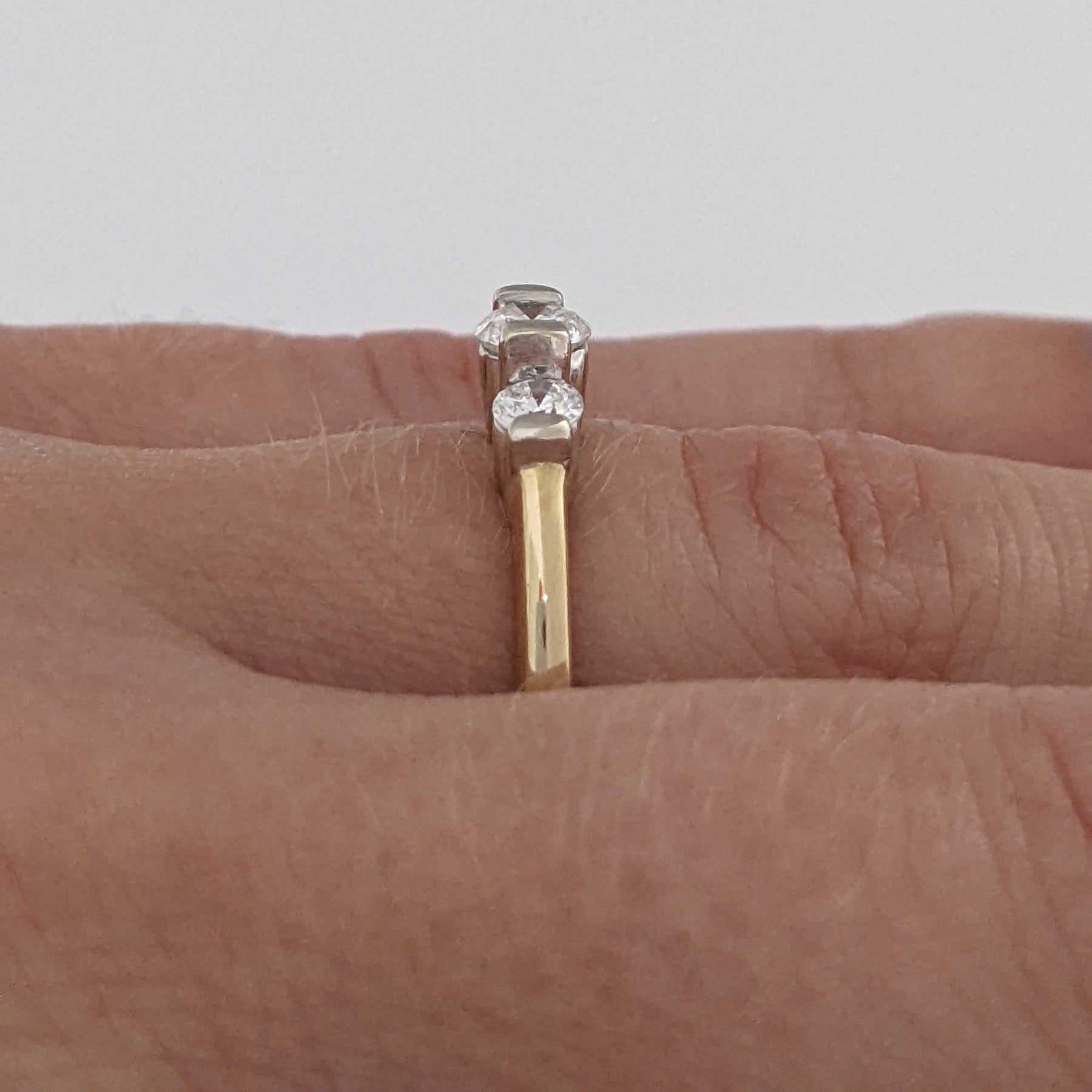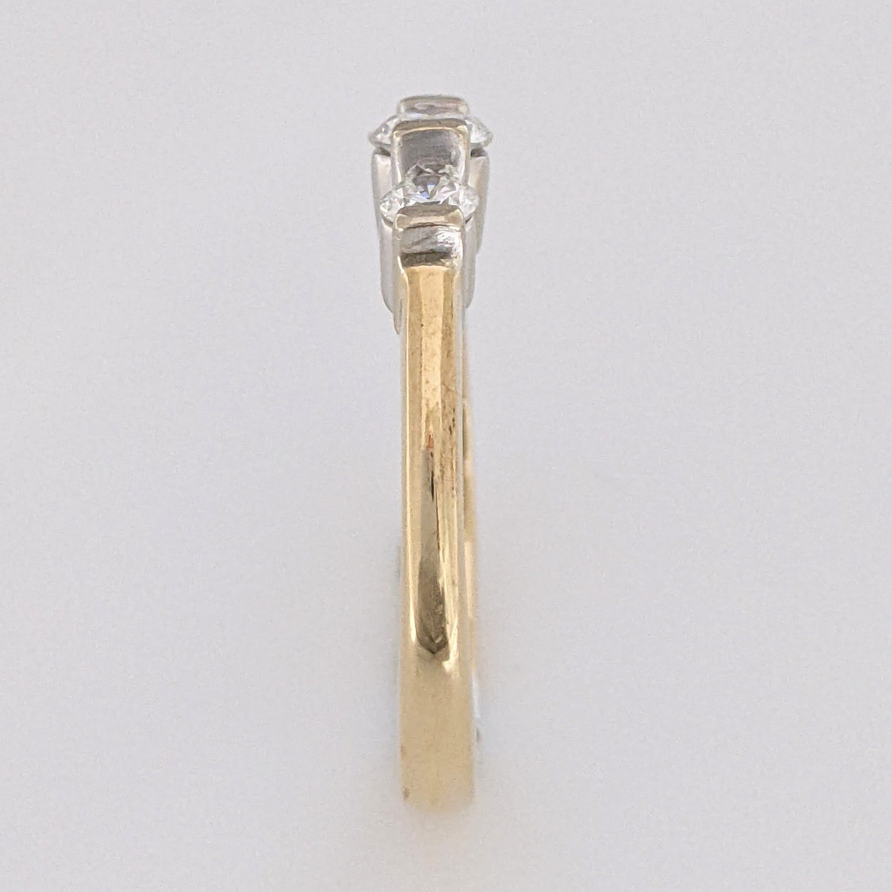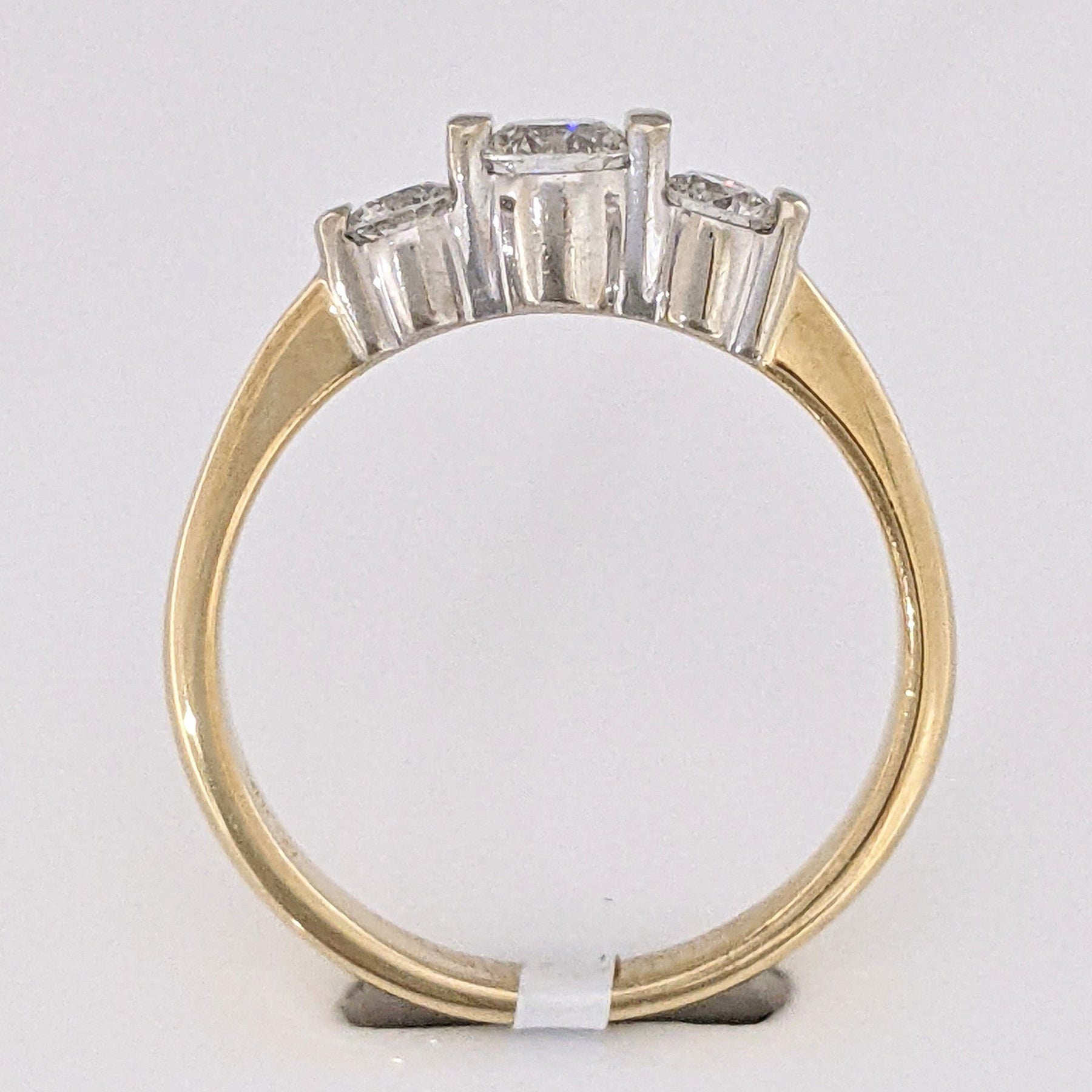 This beautiful 14K trinity estate ring features three round, bar-set diamonds at a total weight of 0.40 carats. Each diamond is SI2 clarity and H color, set in a 3.1-gram gold band. Perfect for a classic, timeless look.