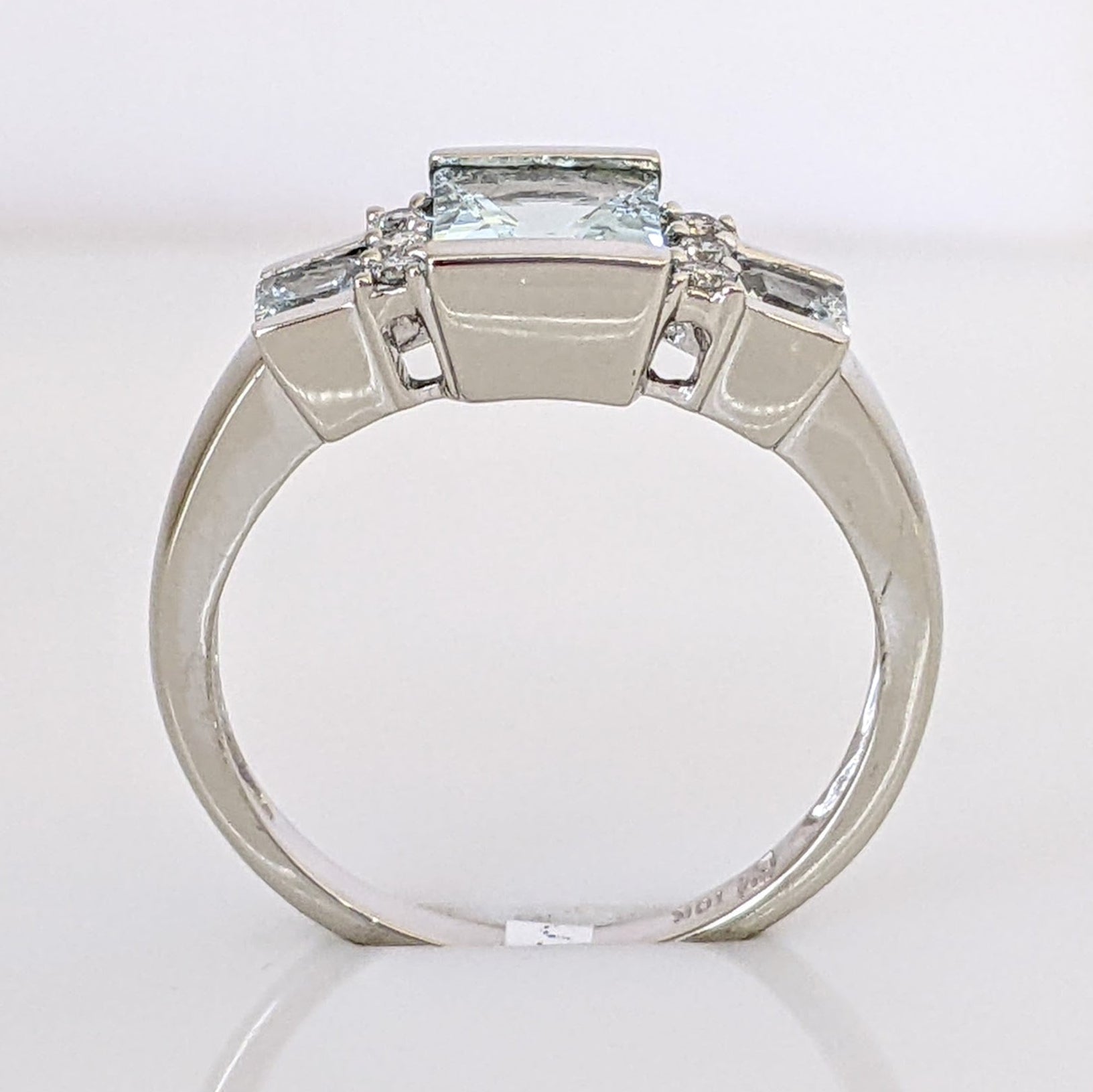 10K WHITE AQUAMARINE PRINCESS CUT (3) WITH (6) ROUND MELEE BEZEL ESTATE RING 2.9 GRAMS