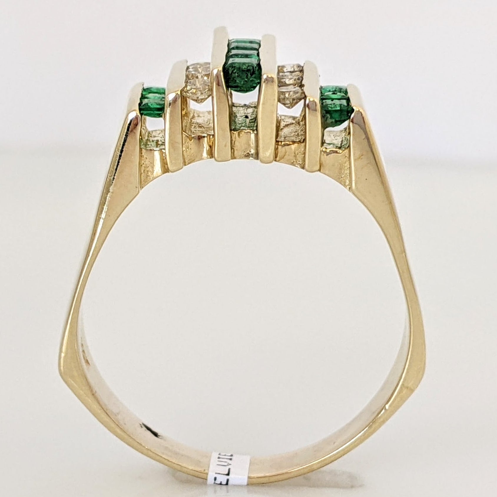 14K EMERALD PRINCESS CUT (10) 1.5-2MM WITH .18 DIAMOND TOTAL WEIGHT (6) ROUND ESTATE BAR RING 6.4 GRAMS