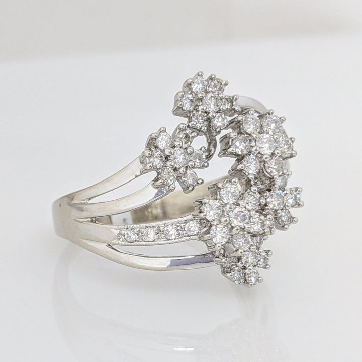 14K WHITE 1.13 CARAT TOTAL WEIGHT I1 G DIAMOND ROUND (50) SIX-CLUSTER FLORAL ESTATE RING 5.6 GRAMS