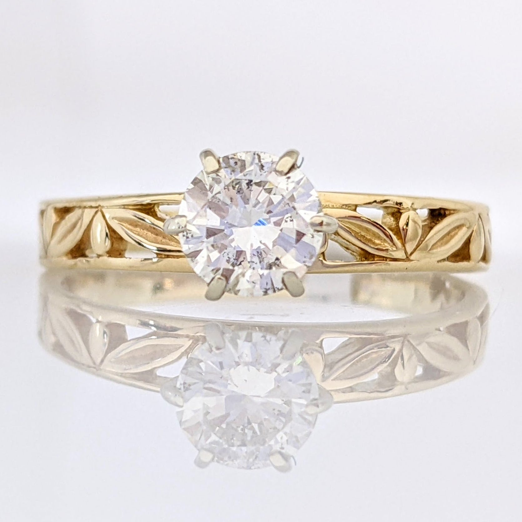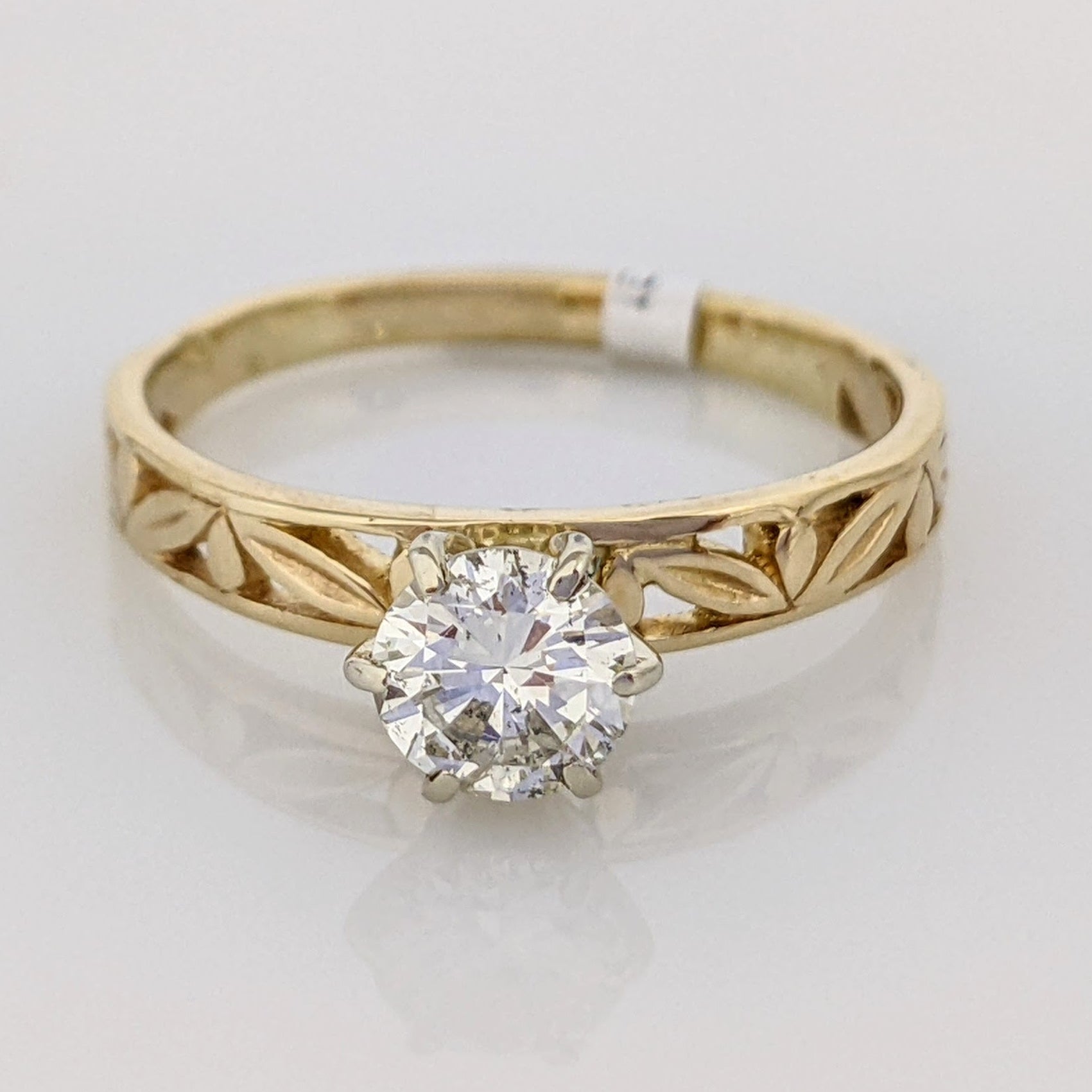 This estate diamond ring is crafted from 14K gold and weighs 2.3 grams. It features a .60 carat total I1 K diamond in a round shape with a fancy shank, making it an exquisite addition to any jewelry collection.