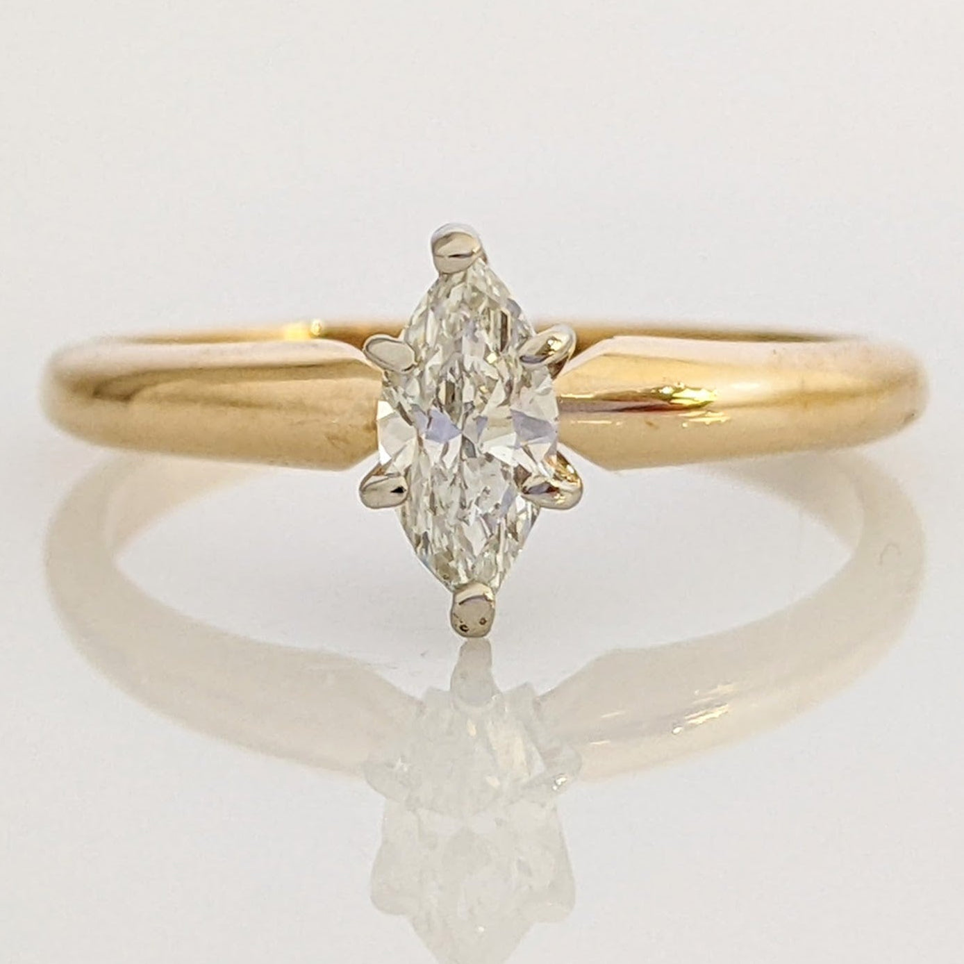 14K .37ct estate yellow gold diamond ring. The ring contains one marquise-shape diamond set into a six-prong head. The ring weighs 2.2 grams