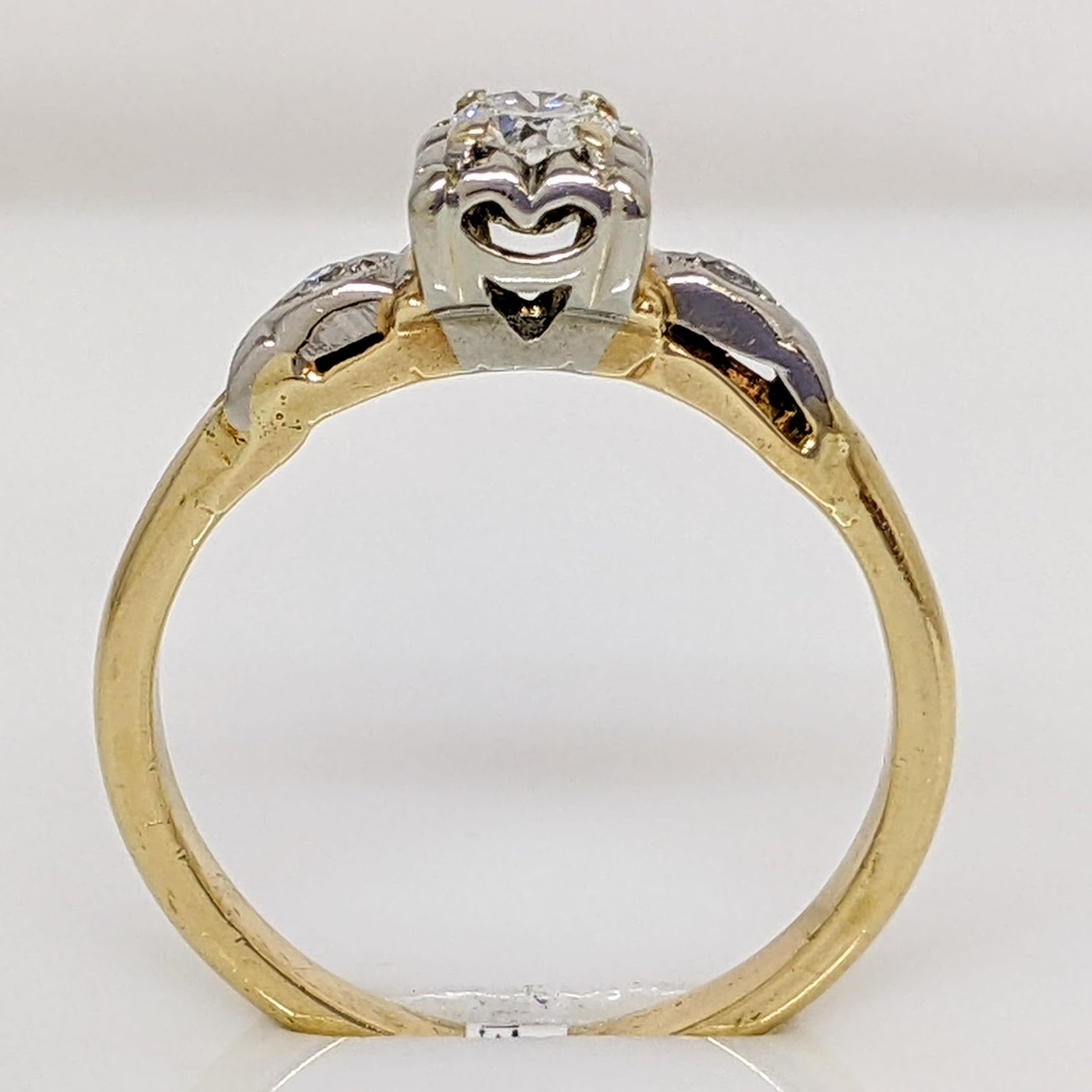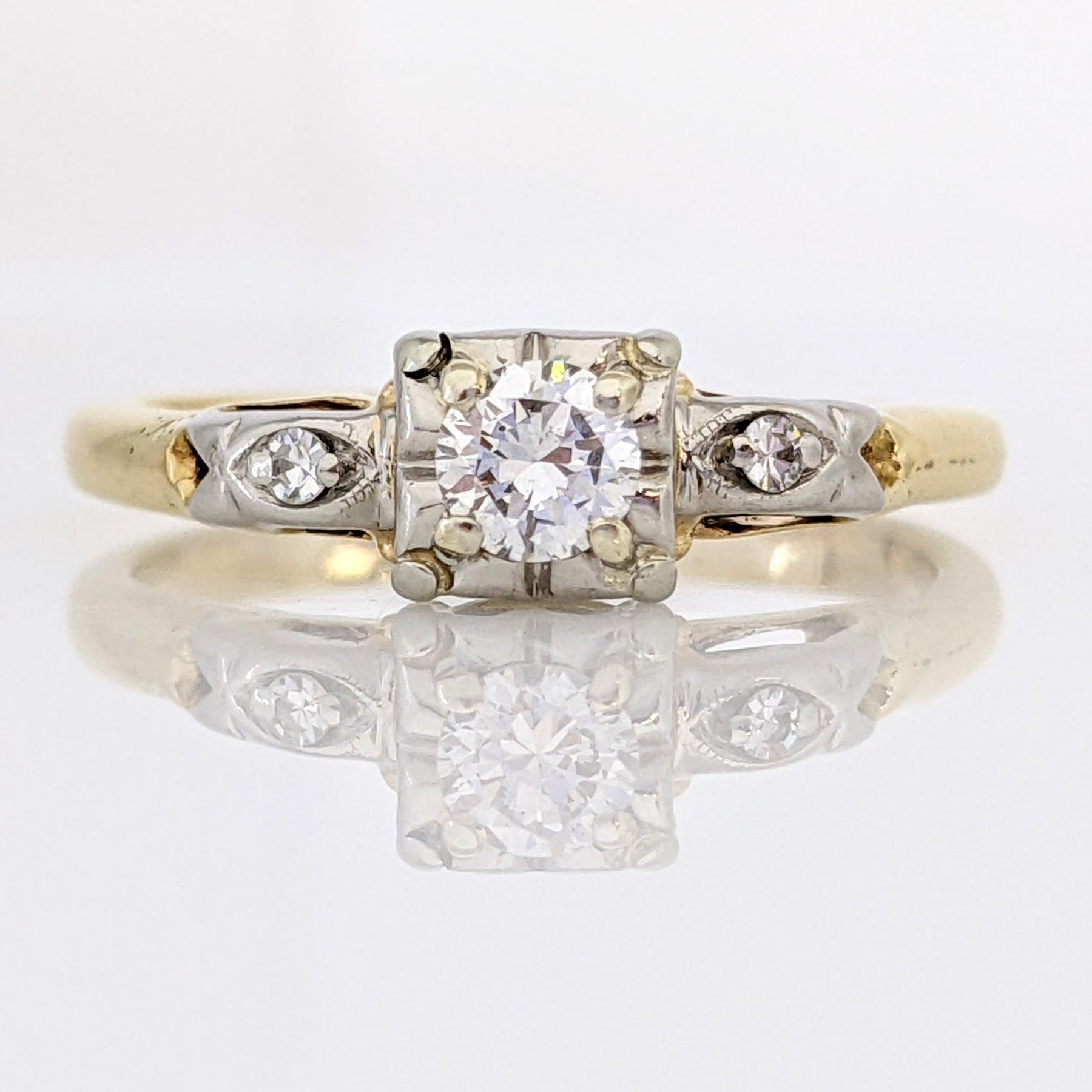 This classic 14K vintage estate ring features three round diamonds totaling 0.18 carats. Clarity is SI2; cut and color graded as H. Total weight of the ring is 1.8 grams. A timeless accessory to be cherished for generations.